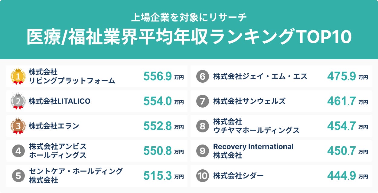 医療・福祉業界平均年収ランキングTOP10を発表!/SalesNow DBレポート