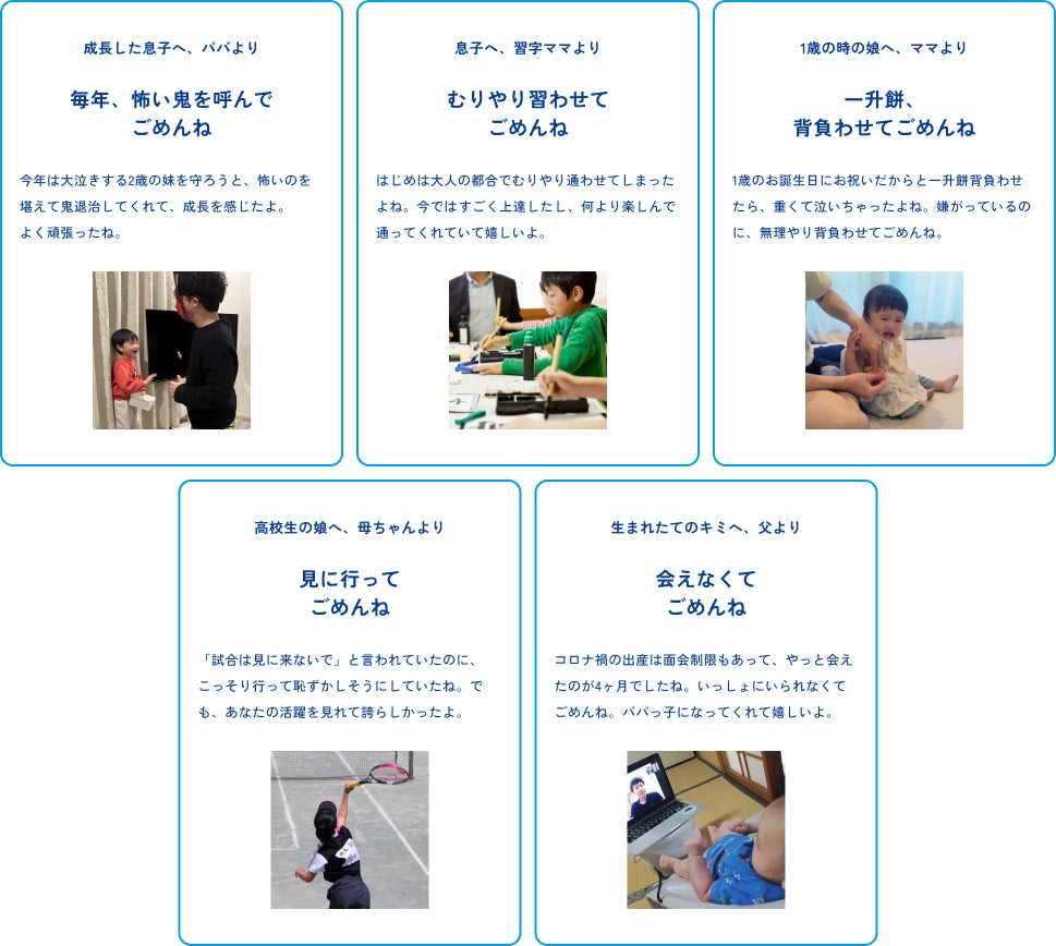 子どもに対して伝えたい“ごめんね”の気持ちやエピソード、写真を募集。ご応募いただいたエピソードは、特設サイトにて公開いたします。 ※なお、写真の提出は任意です。また応募内容の表現や趣旨が本イベントの目的と著しく逸脱する場合や、公序良俗に反する場合は、掲載を見送らせていただくことがあります。予めご了承ください。 |