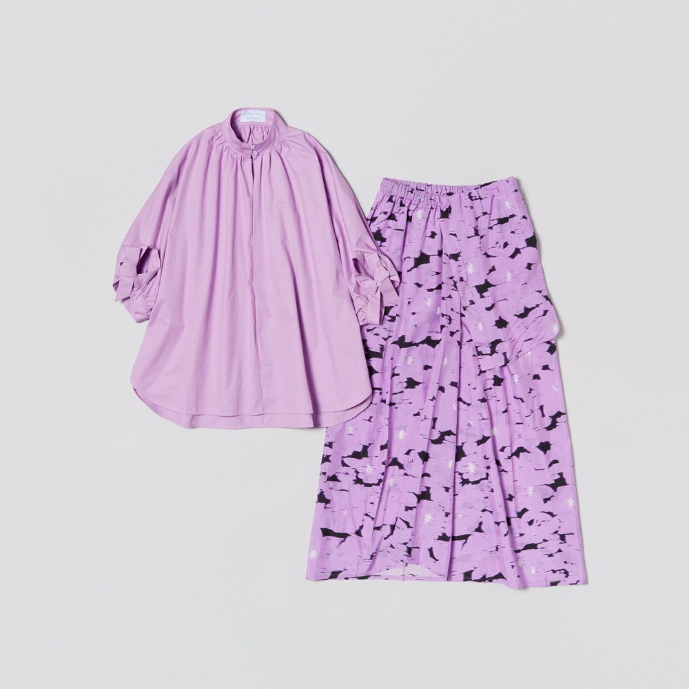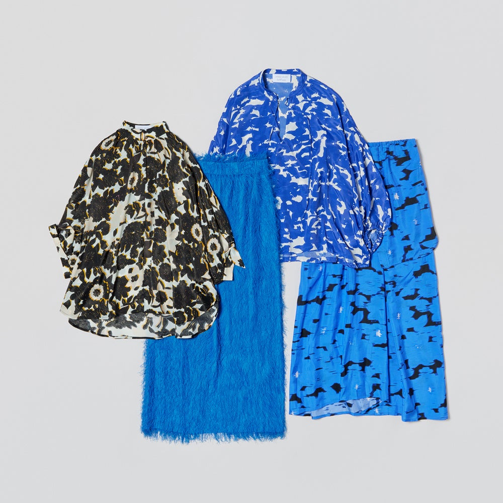 鮮やかなカラーパレットと動くたび表情の変わるシルエットは贅沢な一枚。