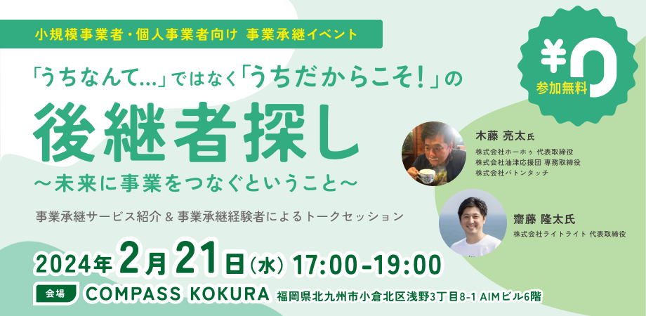 また、新サービスの試行実施に伴い、2024年2月21日(水)COMPASS KOKURA(福岡県北九州市)にて北九州市内の小規模事業者・個人事業者向けの事業承継イベントを開催いたします。