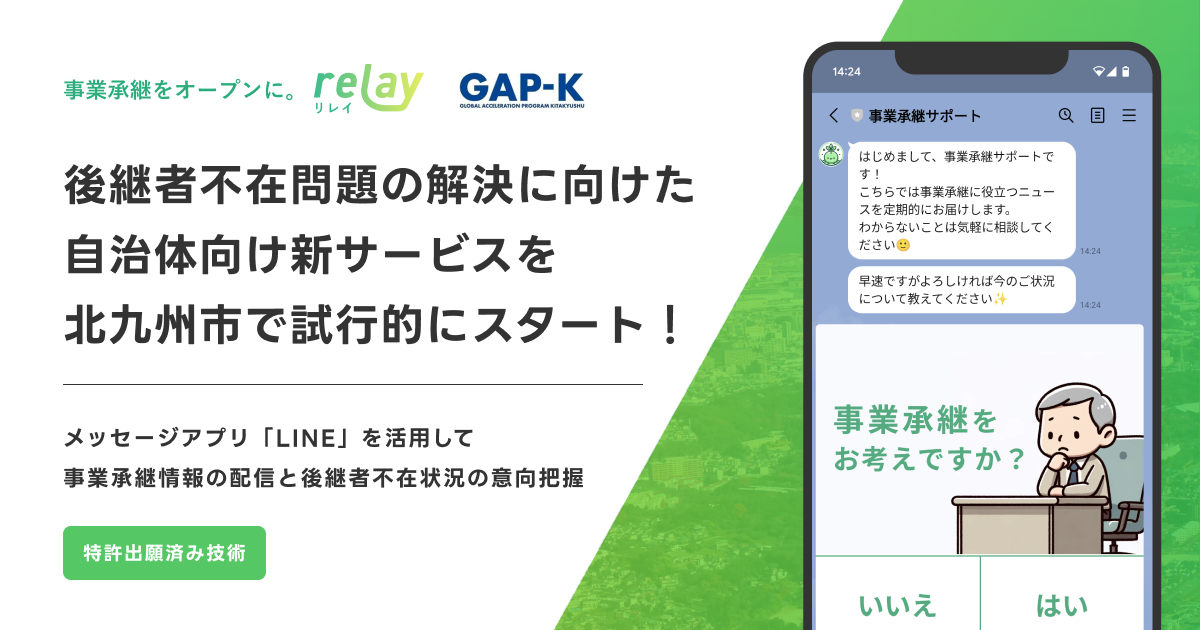 事業承継に関する意向の早期把握および第三者承継という選択肢の認知拡大に向けて、このたびrelayが採択いただいた北九州市主催のグローバルアクセラレーションプログラム「GAP-K」取り組みの一環として、幅広い年代で利用率の高いメッセージアプリ「LINE」を利用した自治体向け新サービス「北九州事業承継サポート(仮称)」を試行的に実施いたします。