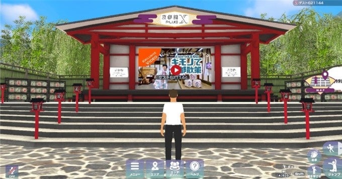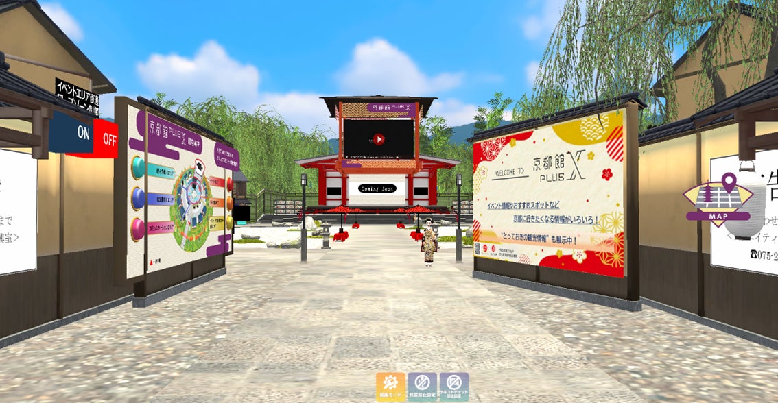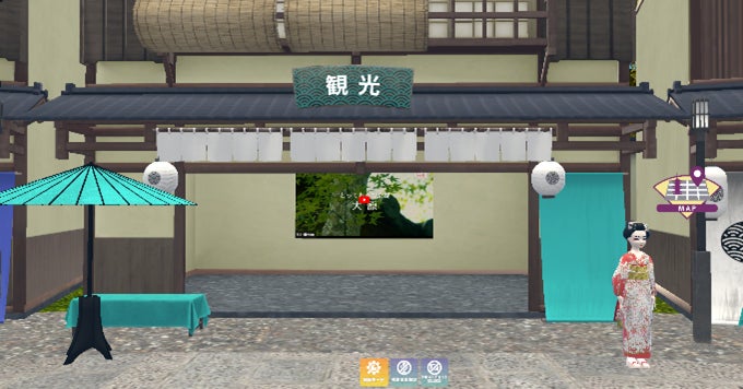 京都情報の発信を目的に、京都市が令和4年3月に開設。空間上にモニターやパネルを設置し、伝統産業や京都市のイベント、観光資源等の京都の魅力を発信するとともに、メタバース上で人々が交流できる場づくり等を目指します。