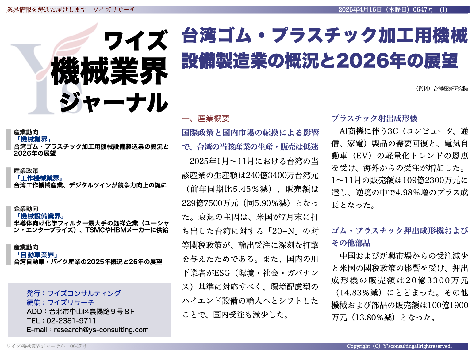 ワイズコンサルティング グループ(本社:中華民国台北市、代表取締役:吉本康志)は台湾機械業界専門誌「ワイズ機械業界ジャーナル」の2026年4月第3週号を発行しました。