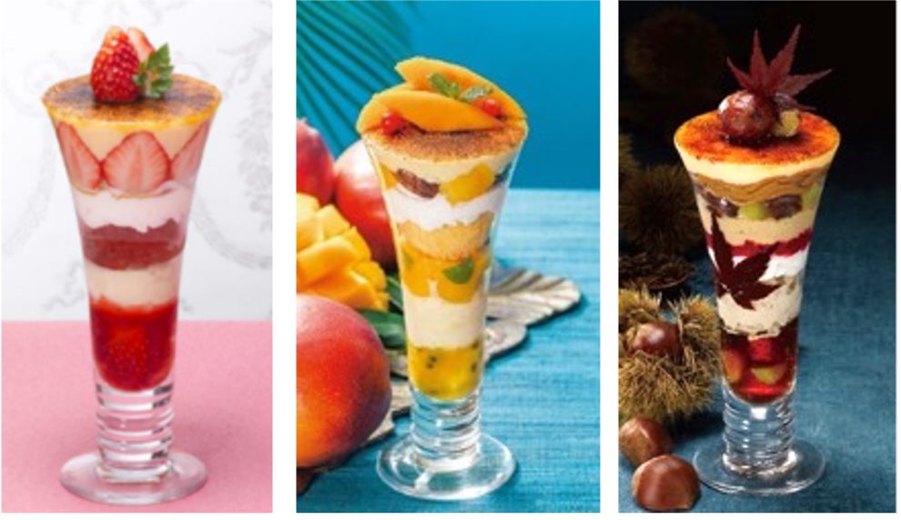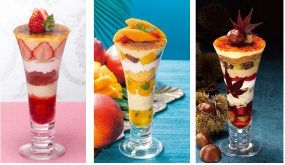 2014年から開始したロイヤルホストの季節デザート。現在では1年の中で苺やマンゴー、メロンやマロン、りんごといった旬のフルーツをテーマに、こだわりのパフェを展開しています。中でもカリッとキャラメリゼしたクレームブリュレから始まるブリュレパフェは通年を通して大人気です。
