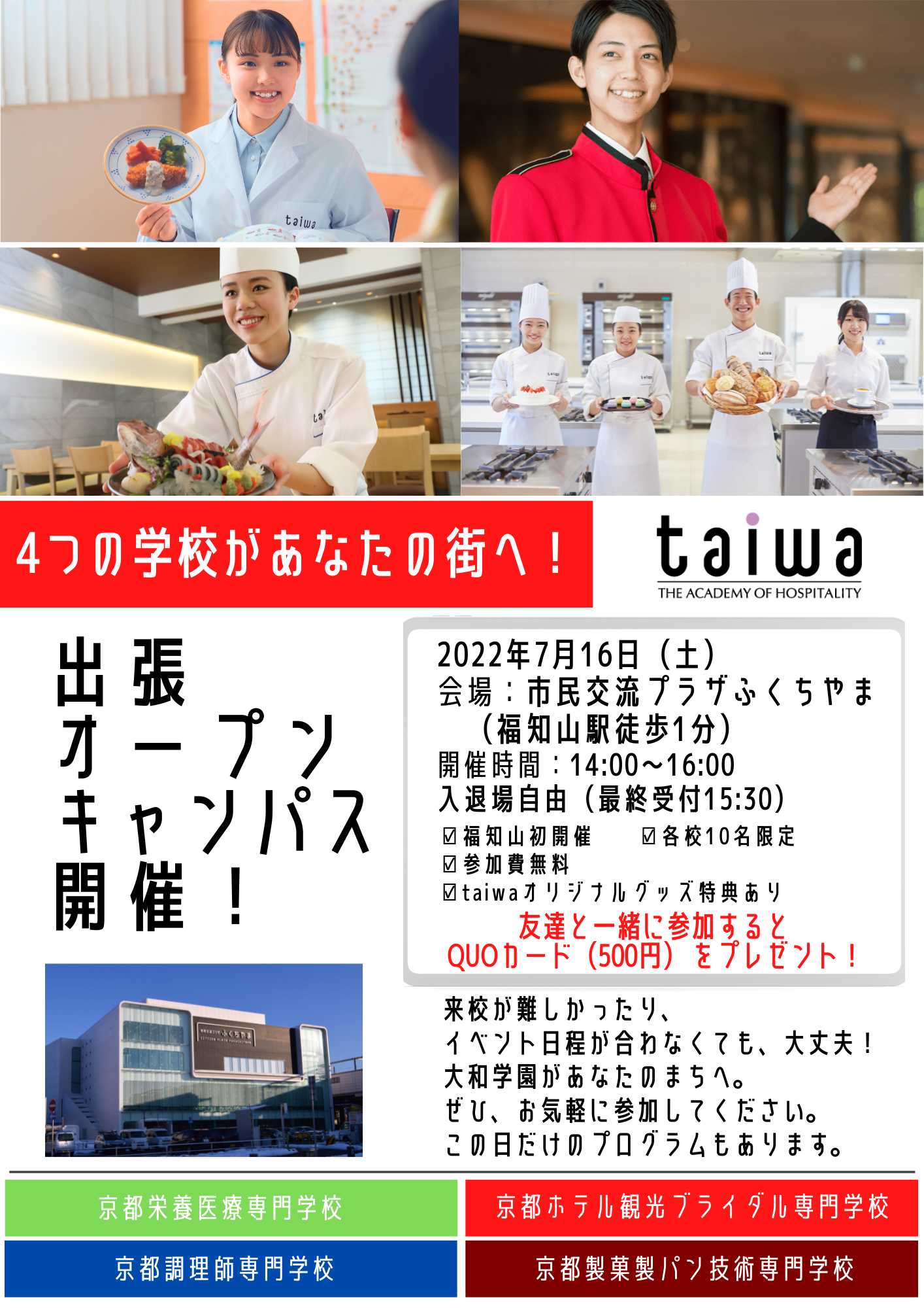 2022年7月16日(土)学校法人大和学園グループは京都府福知山市へ出張し、栄養・医療事務・調理・製菓・製パン・ホテル・旅行・観光・ブライダルに興味のある方を対象としたオープンキャンパスを実施します。世界観光都市「京都」で学ぶ魅力や、ホスピタリティ業界で働く魅力について丁寧に説明します。ホスピタリティ業界に興味がある方はぜひこの機会にご参加下さい。(新型コロナウイルス感染症予防対策として、マスクの着用や検温、アルコール消毒を十分に行い、3密を避けて実施いたします。)