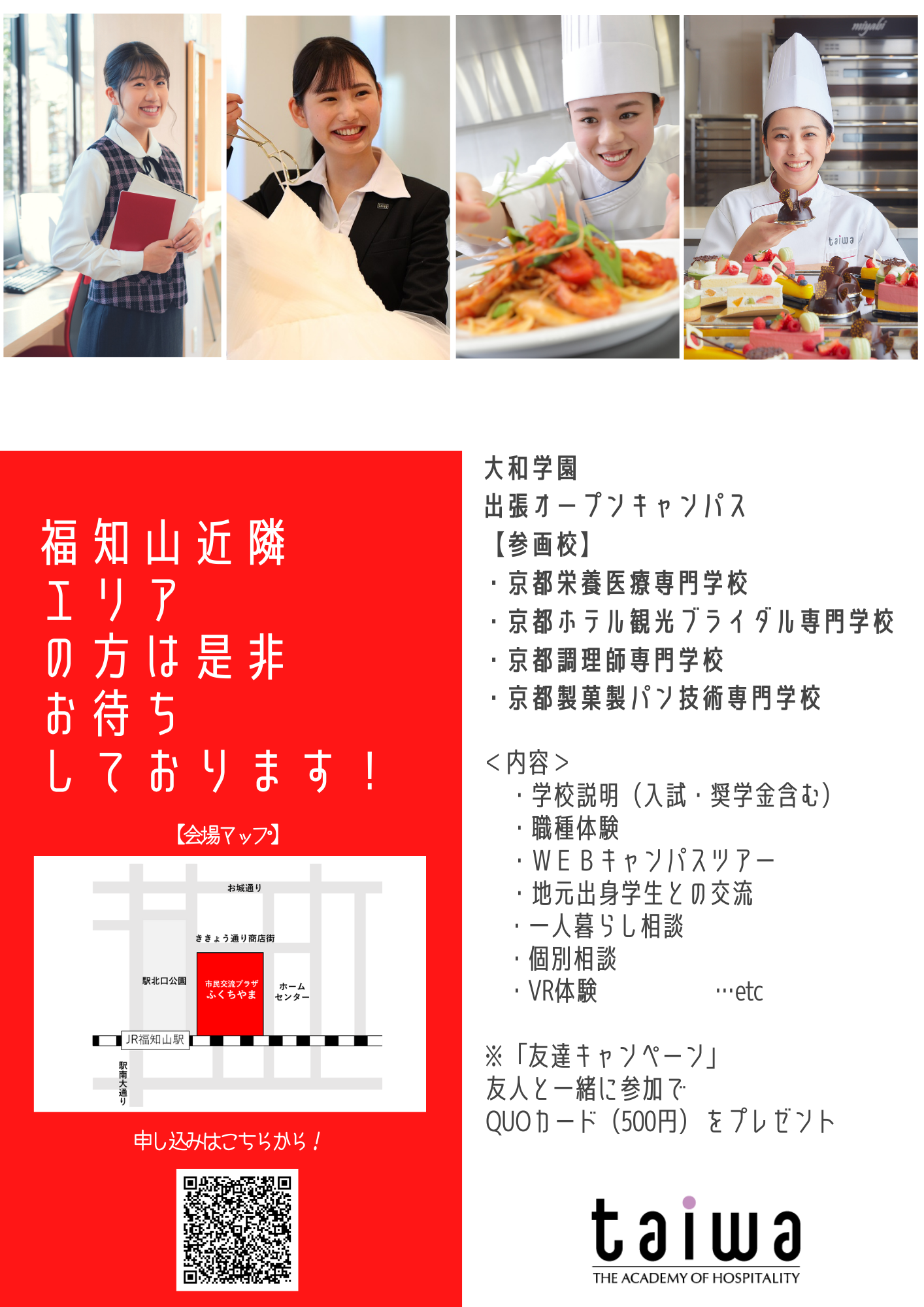 学校法人大和学園は栄養・医療事務・調理・製菓・製パン・ホテル・観光・ブライダル業界に興味がある高校生に対し、福知山市にて特別出張イベントを実施!ホスピタリティ業界をめざすすべての方を応援します。