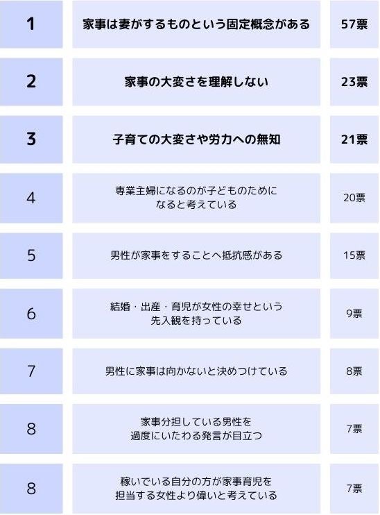 (8位)家事分担している男性を過度にいたわる発言が目立つ
