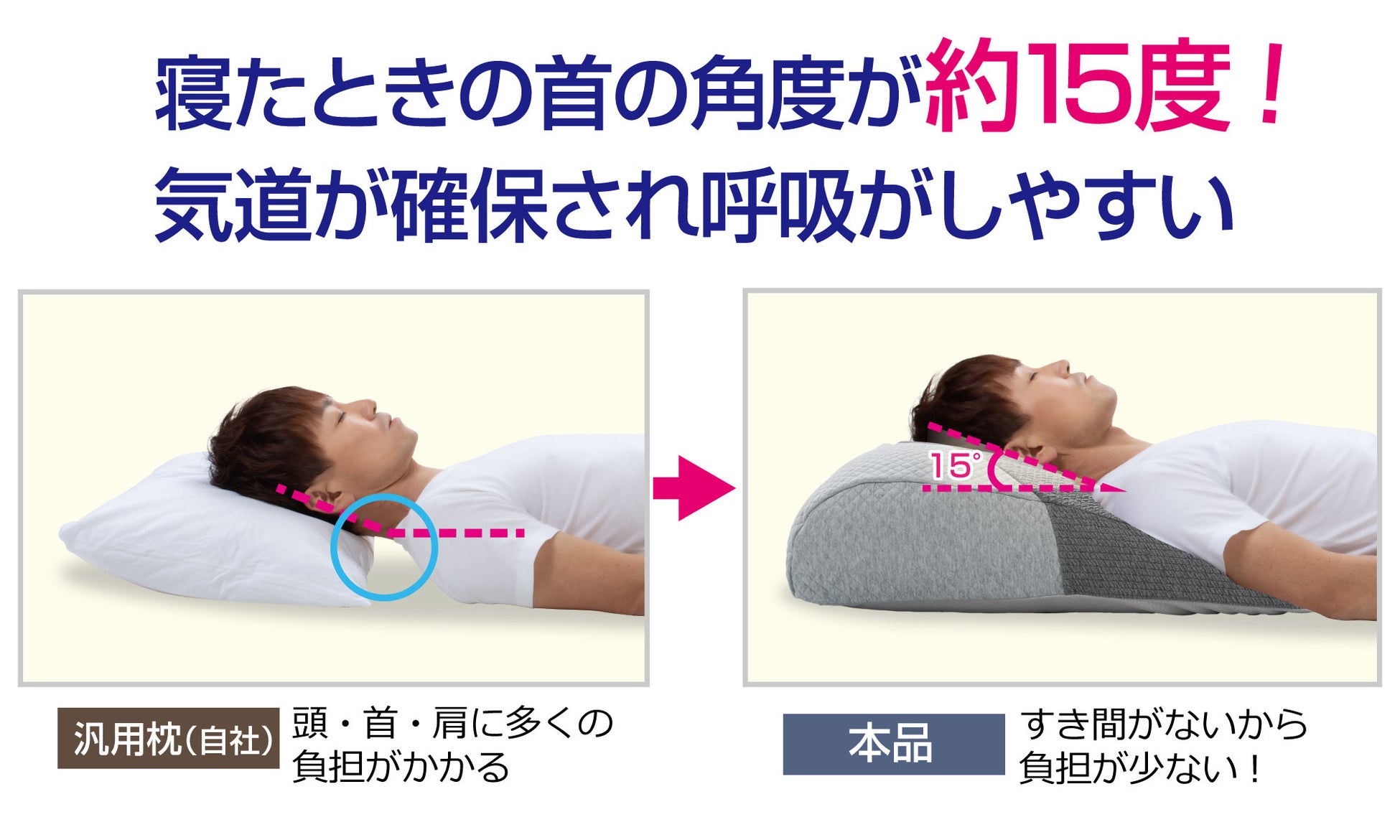 頭を約15℃の角度高く上げることで首にすき間を作らず負担もかかりにくいです。