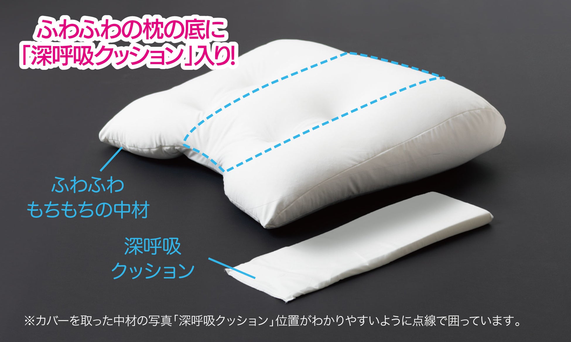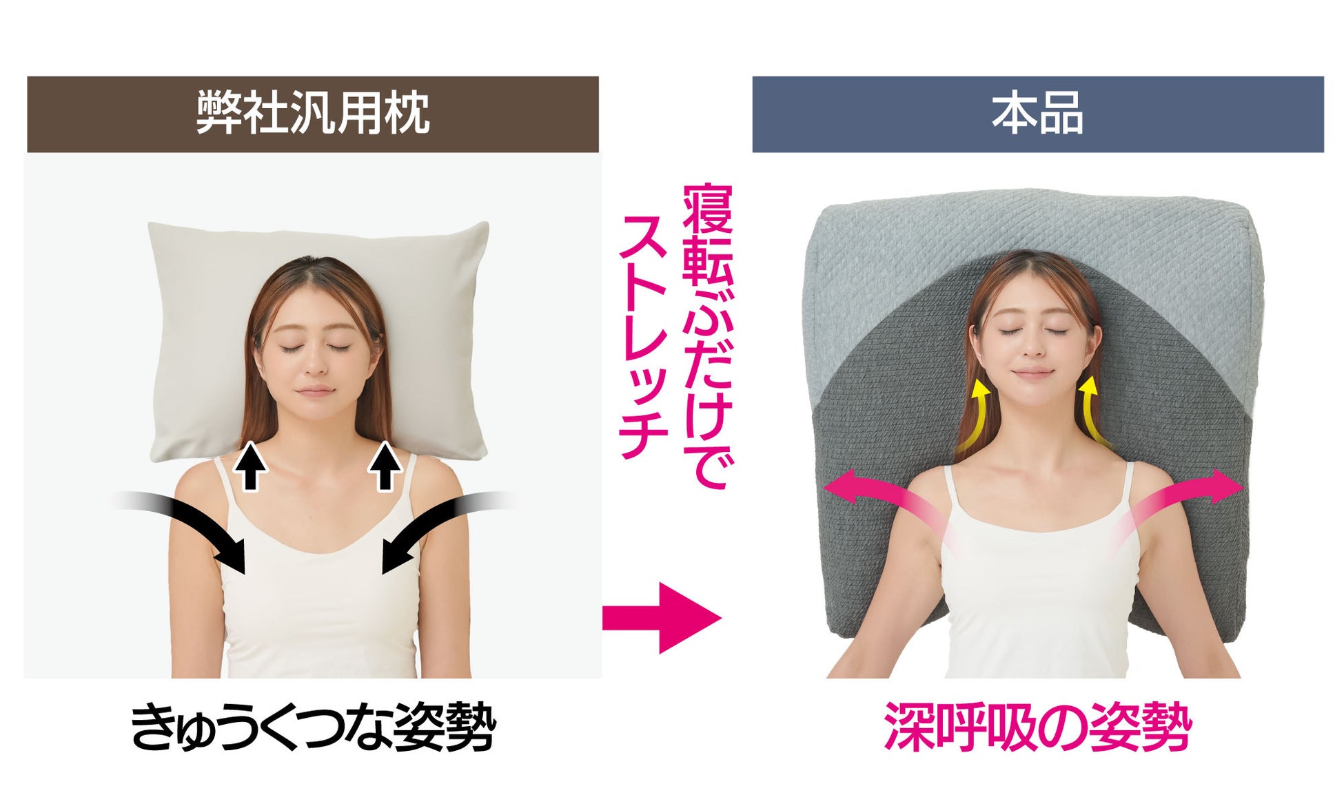 ボリュームのあるふわふわもちもちの中材が体を支え、寝転ぶだけで胸が開き、呼吸のしやすい寝姿勢が作られます。また、中央に内蔵している深呼吸クッションにより背筋が伸び、肩甲骨が中央に引き寄せられることで気道確保もしやすく、呼吸がしやすい!