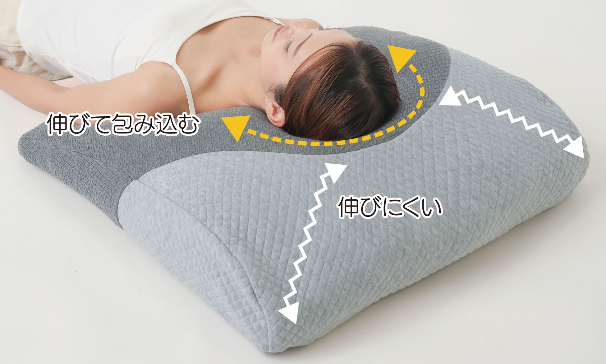肌触りが良く、上側と中央に伸縮性の高い生地と伸縮性の低い生地を組み合わせたカバーは中材の流れを防ぎ、ハンモックのように頭を包み込ます。