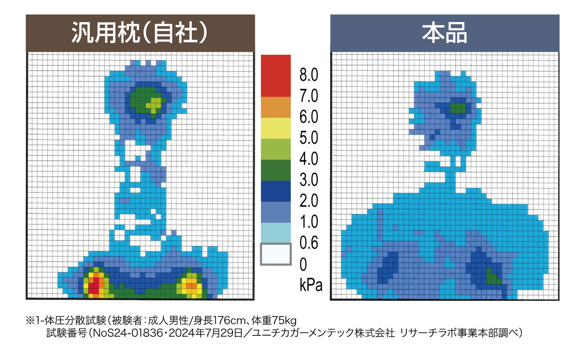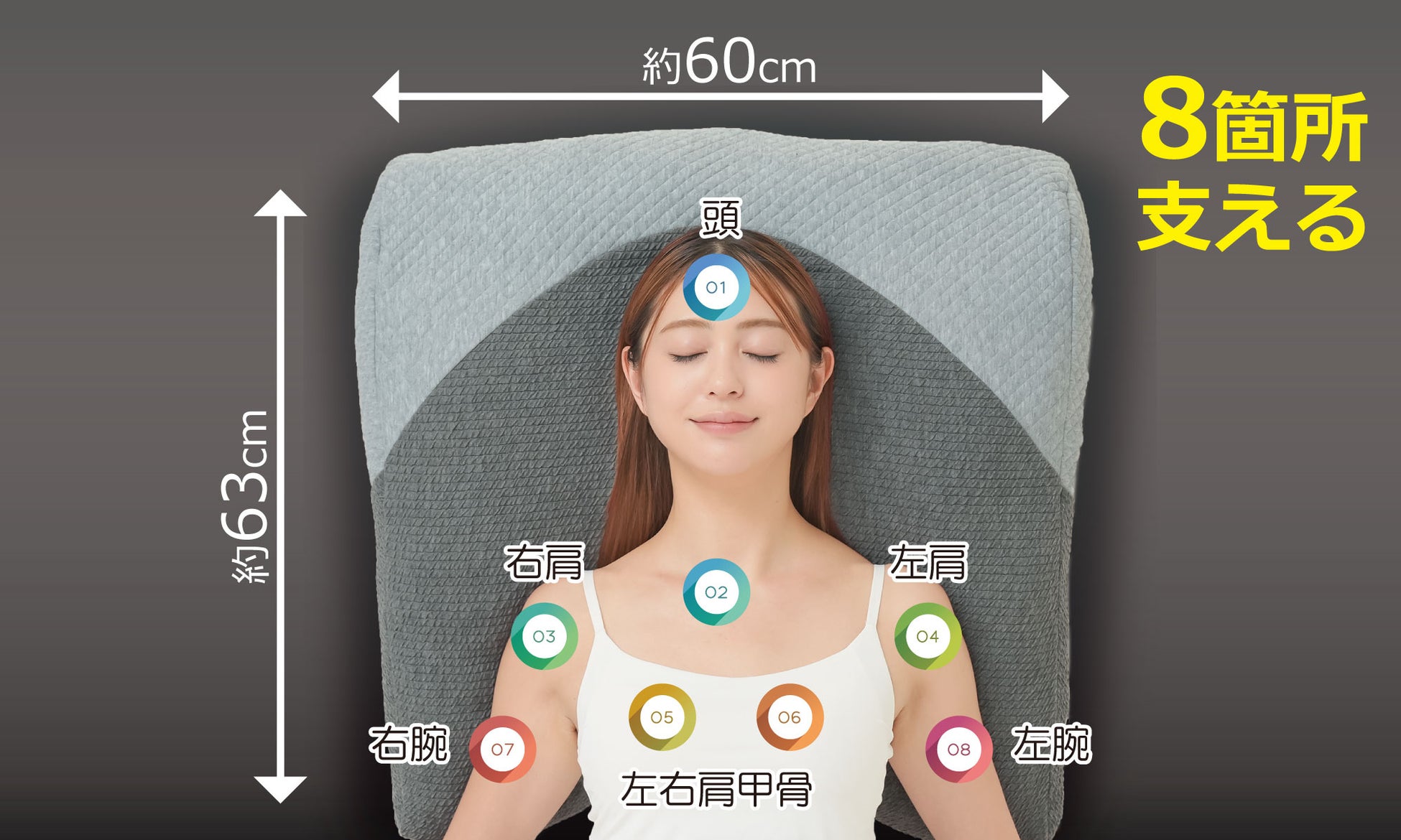 ビッグサイズで頭・首・肩・腕・肩甲骨にすき間なくフィットします。体圧が一点に集中せず、高い体圧分散性を実現しました。