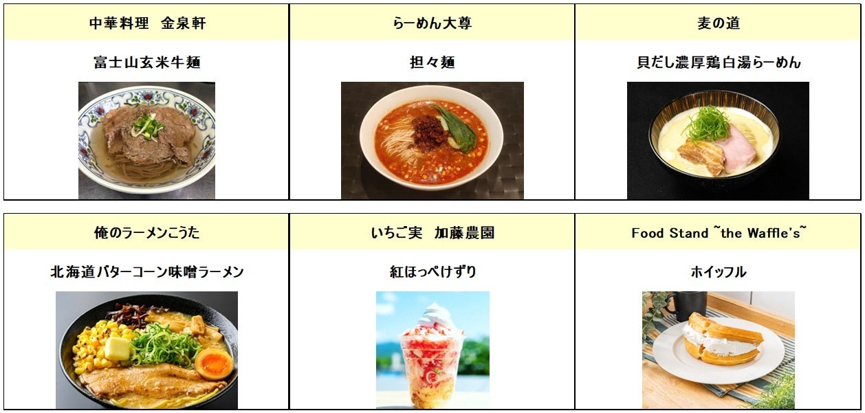 「スーパーフォーミュラーメン選手権」に加え、地元静岡の『富士宮焼きそば』から、唐揚げ、ナポリタン、スイーツに至るまで、多彩なバリエーションで皆様のご利用をお待ちしております。