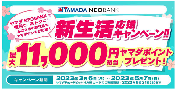 株式会社ヤマダホールディングス(本社:群馬県高崎市、代表取締役会長兼 社長 CEO:山田 昇)は、株式会社ヤマダデンキ(本社:群馬県高崎市、代表取締役社長:上野 善紀、以下、ヤマダデンキ)を通じて提供しているヤマダNEOBANKをより知っていただくため、2023年3月6日(月)から、サービスの利用に応じて最大11,000円相当のヤマダポイントをプレゼントする「 新生活応援キャンペーン 」を実施することをお知らせいたします。
