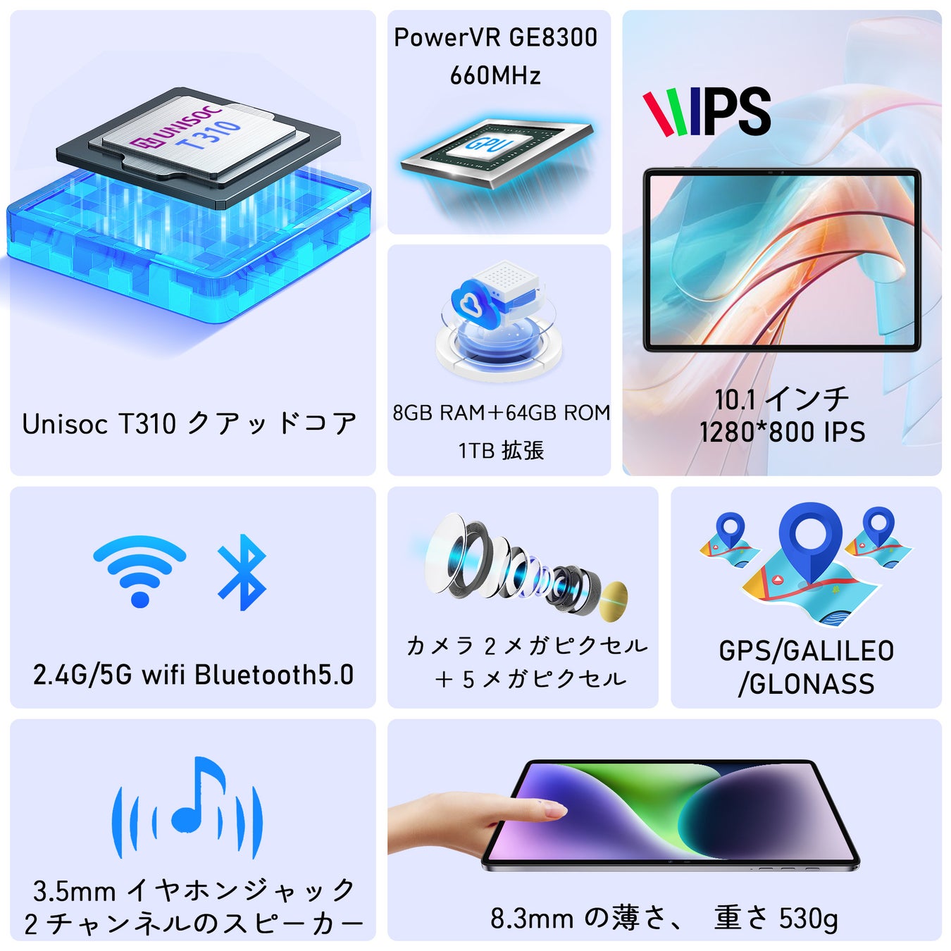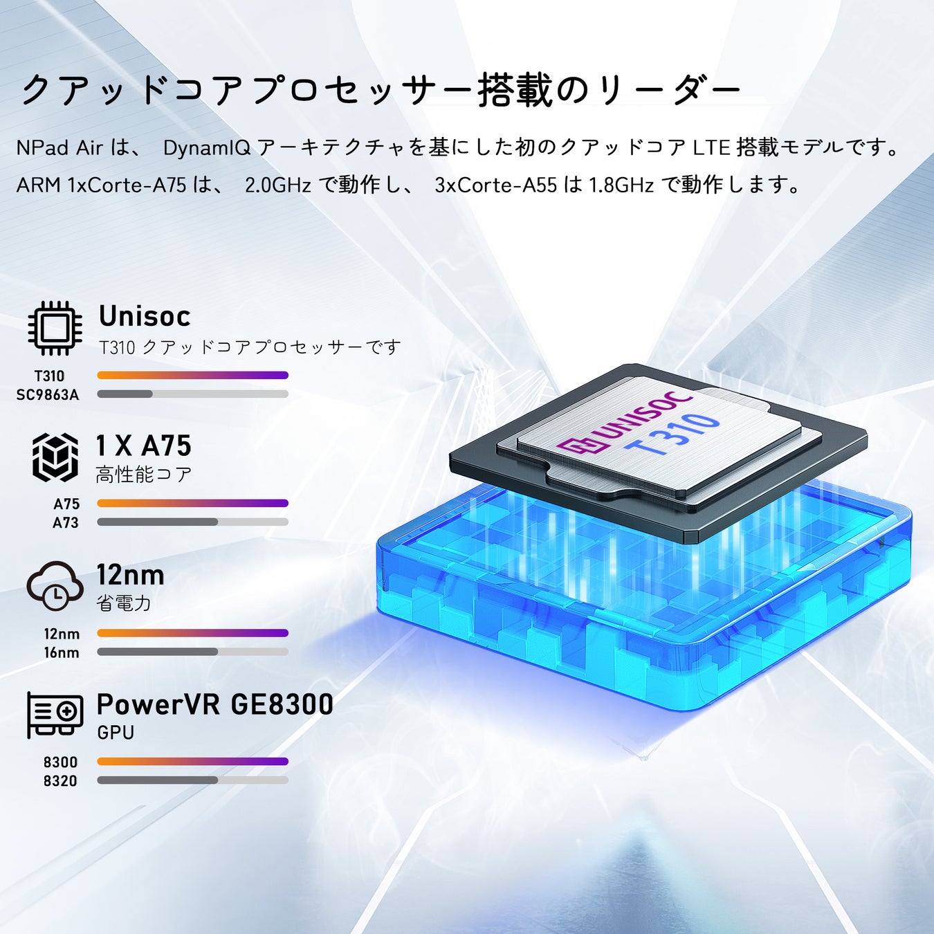 高性能4コアCPU + 大容量メモリ: N-one Npad Air Android12 タブレットはUnisocの4コアCPU「CPU T310」を搭載。低消費電力と低発熱で、PVR GE8300グラフィックスプロセッサと組み合わせて、軽快な動作と高速な処理が可能。多彩な機能が強化され、動画視聴やウェブプラウジング、音楽鑑賞などが最適。