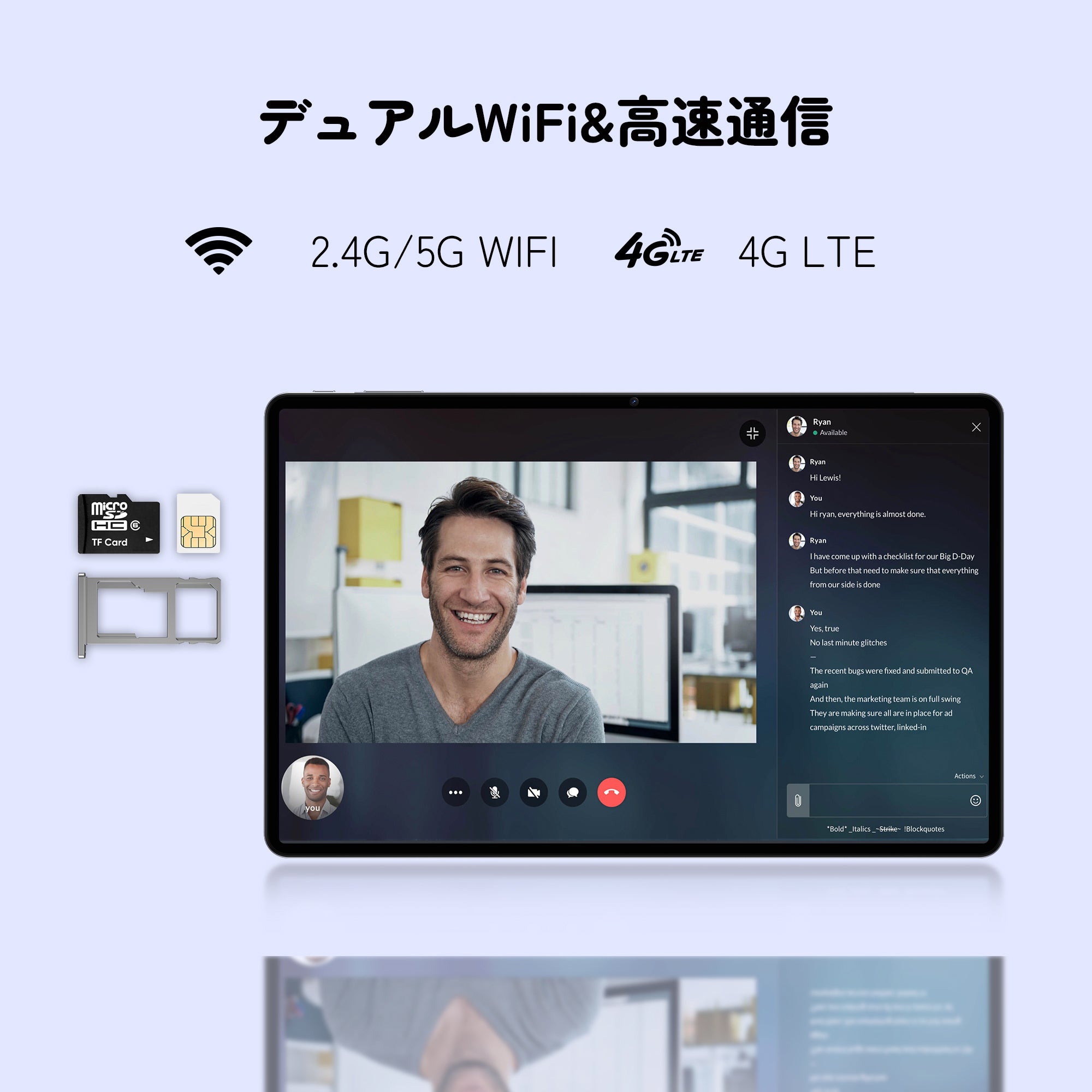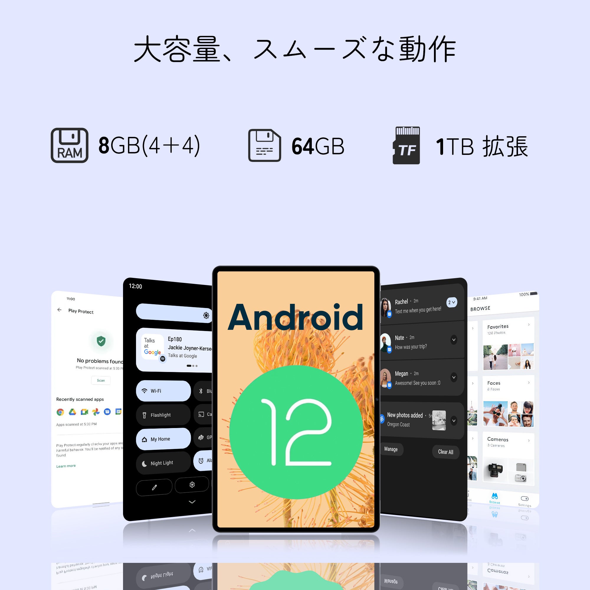 大容量のメモリとストレージ: 8GBのRAMメモリ(内蔵4GB + 拡張4GB)と64GBの内部ROMメモリに加え、最大1TBまでのTFカードサポート。多彩なアプリケーション利用や大容量データの管理に対応。