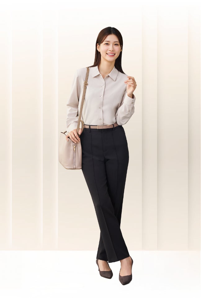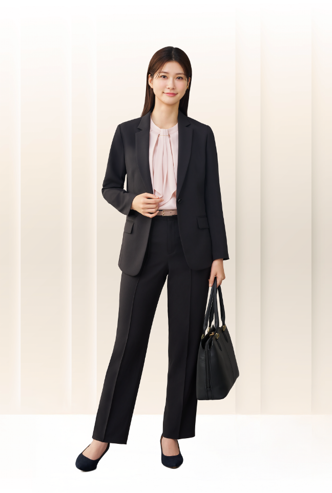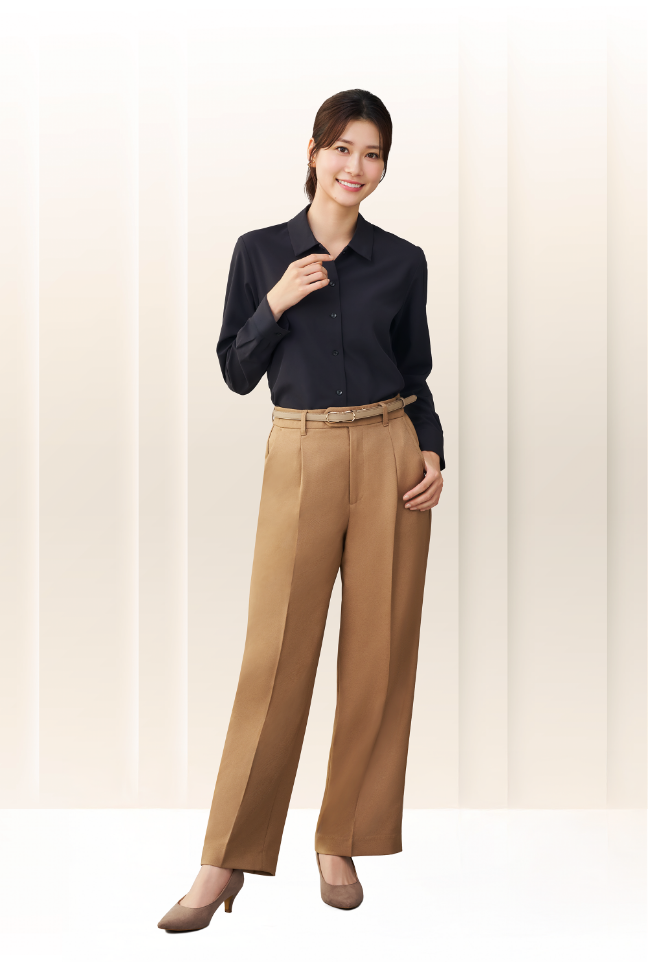 レディーススタイルは、昨今ビジネスウェアに求められるきちんと感とリラックス感を両立するために、生地にはポリウレタンを使用。これによりすっきりとしたデザインながらもストレッチ性が高まり、ビジネスパーソンはもちろん、初めてスーツを着用する方でも快適に着用できます。ジャケットは、立体的なシルエットを実現するため、身頃部分を4枚の生地パーツで仕立てることでジャケットがきれいに体のラインに沿い、すっきりとした印象を演出します。パンツはシーンを問わない定番のストレートシルエットで、センター部分にピンタックを施すことで、脚長効果が期待できます。品質もさることながら、価格は上下で税込12,980円と圧倒的なコスパを実現しました。