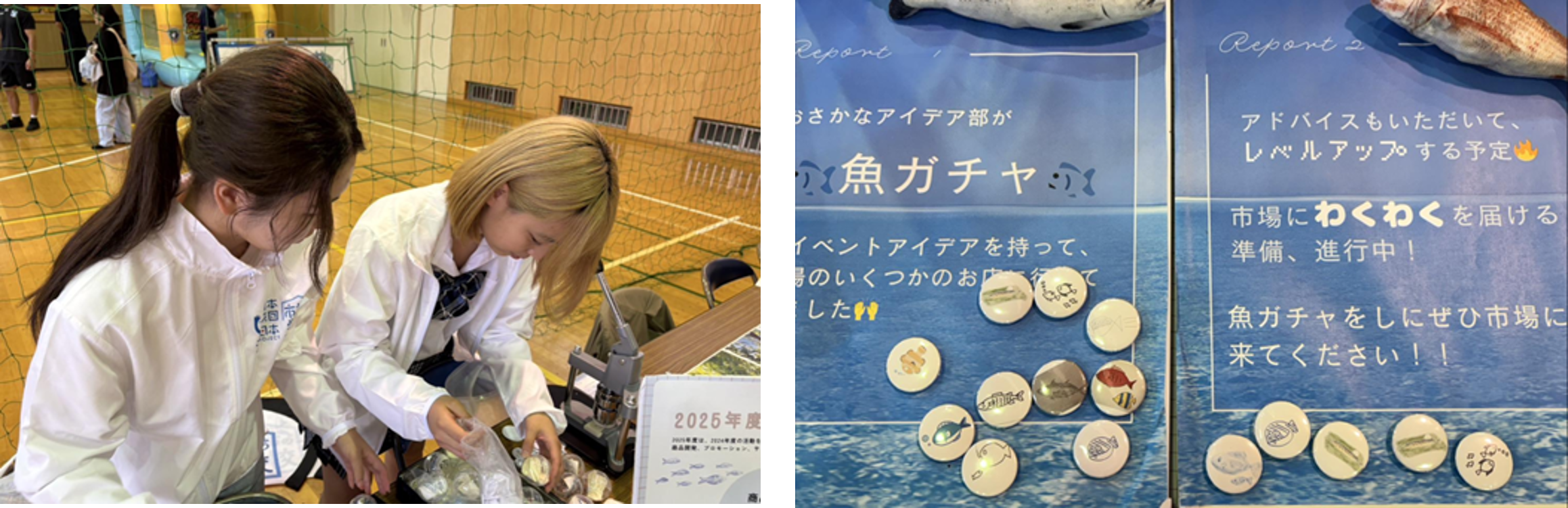 今回のイベントに参加するにあたって、準備も高校生たちで行いました!今回は、私たちの活動「魚ガチャ」の説明を聞いてもらえると回せるガチャガチャを「出張ガチャ」として設置。ガチャ玉の中に入れるシールと缶バッチのデザインは、メンバー各々が描いた魚イラストです。普段の様子とイラストにギャップのあるメンバーもいておもしろかったです。