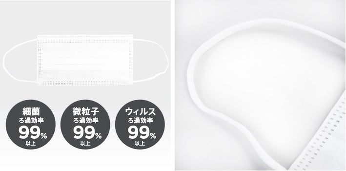 高性能な3層プリーツタイプです。耳が痛くなりにくい平ゴムを使用。