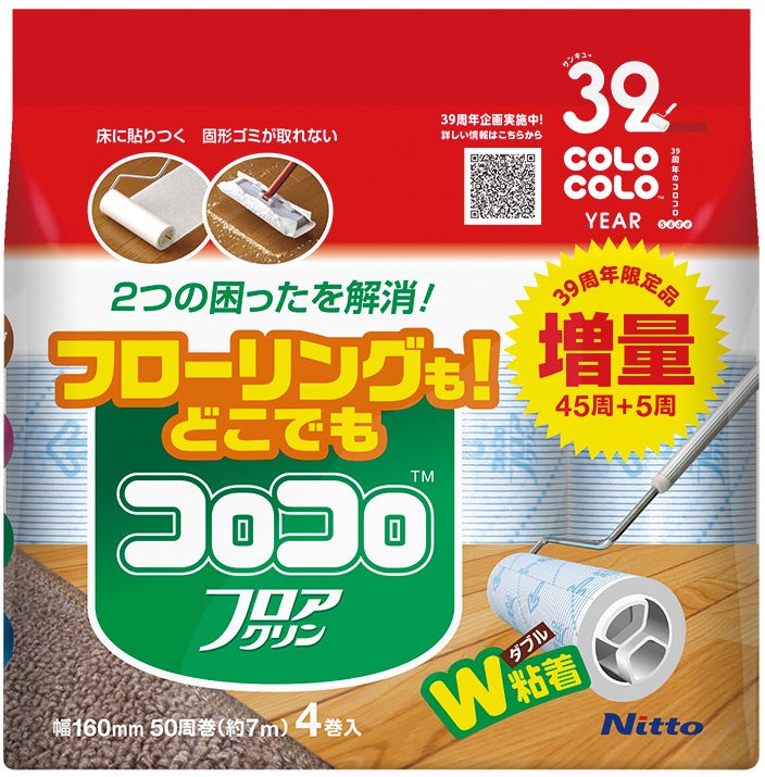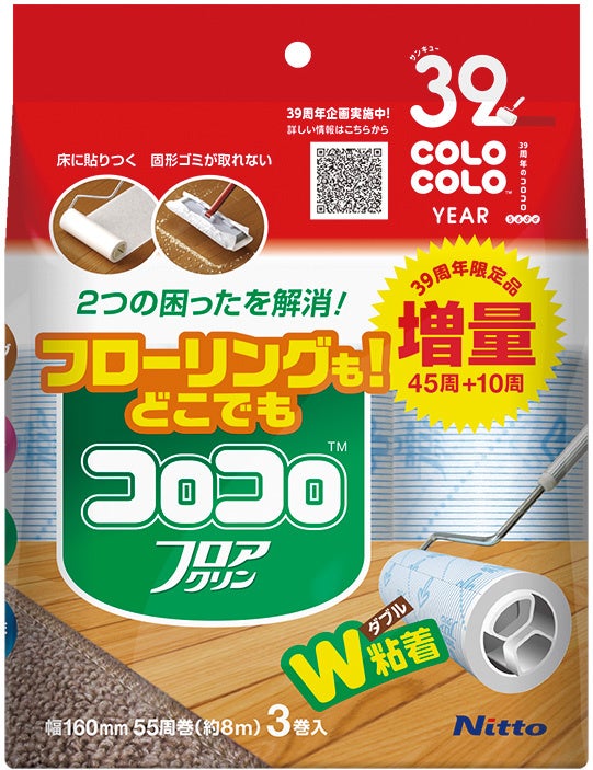 1983年に発売した『コロコロ』は、転がすだけの簡便さとゴミをくっつけて取り除くという新発想が世の中のお掃除シーンに受け入れられ、長きにわたり支持されているロングセラー製品です。当社は、発売39周年を迎えた2022年を、「39(サンキュー)COLOCOLO YEAR」と称し、日頃のご愛顧への感謝を伝える1年と位置づけ、Twitterキャンペーンなどの記念施策を実施しています。この度、日頃よりご愛用頂いているユーザ―の皆様への感謝の気持ちを込めて「コロコロ フロアクリン」、「コロコロ ハイグレードスカットカット強接着」のスペアテープ3巻入りと4巻入りについて、従来品のテープよりも長尺となる増量品を数量限定で発売します。「コロコロ フロアクリン」3巻入り及び「コロコロ ハイグレードスカットカット強接着」3巻入り・4巻入りは10周分、「コロコロ フロアクリン」4巻入りは5周分増量しています。