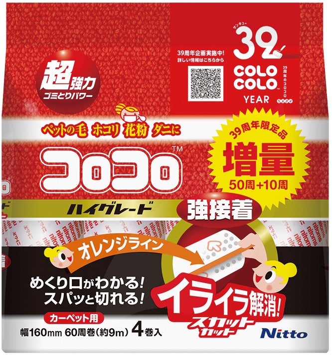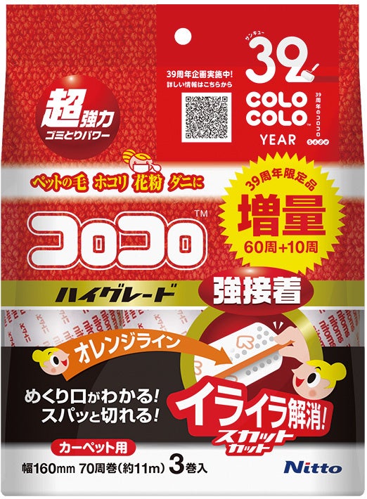 株式会社ニトムズ(本社:東京都品川区、代表取締役:中村 晃章)の発売39周年を迎える『コロコロ』は、お客様への感謝の気持ち込めて、2022年7月1日(金)より「コロコロ フロアクリン」「コロコロ ハイグレードスカットカット強接着」のスペアテープ(3巻入、4巻入)増量品を限定発売いたします。