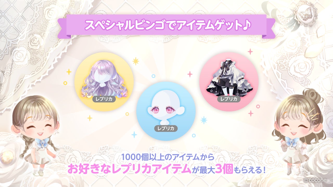 新しいお客様も、今遊んでいるお客様も楽しめる特別な「ビンゴ」を開催します。1000個以上のアイテムの中からお好きなレプリカアイテムを、最大「3個」もらえるチャンスです。