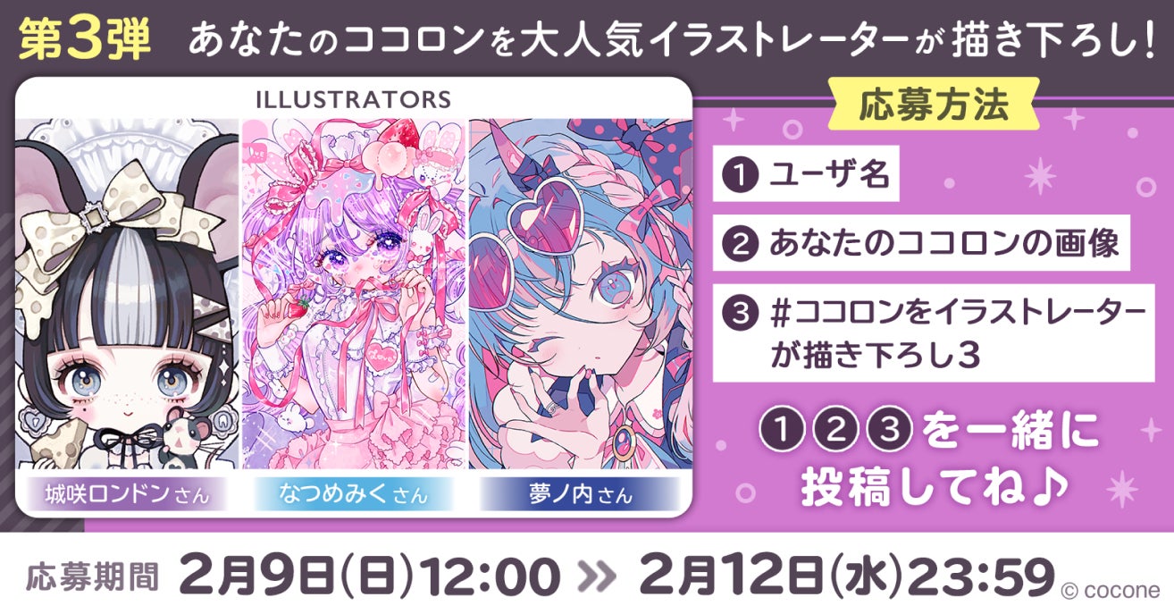 5周年を記念して、大人気イラストレーター「双木樹さん」「本田ロアロさん」「さくしゃ2さん」「くろうめさん」「城咲ロンドンさん」「なつめみくさん」「夢ノ内さん」を迎えた特別なSNSキャンペーンを開催中です。本キャンペーンでは、お客様が作成した「ココロン(アバター)の画像」を「ユーザー名・対象のハッシュタグ」とともにXに投稿することで応募が完了。
