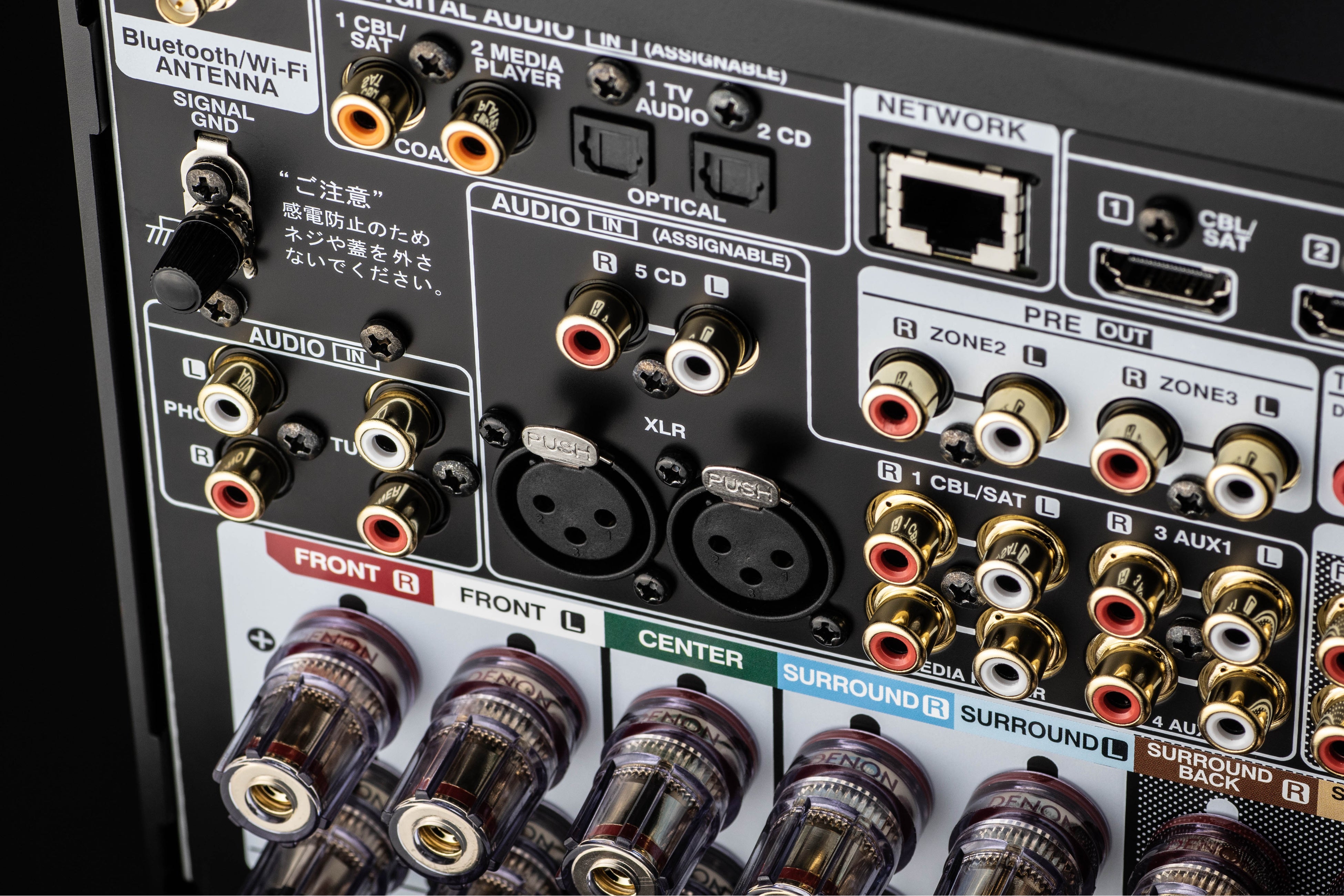 AVC-A1Hは、アンバランス(RCA)およびバランス(XLR)のサブウーハープリアウトをそれぞれ4系統装備しています。部屋の4隅にサブウーハーを設置して、各サブウーハーに周囲のスピーカーの低域成分を割り当てることにより、従来のホームシアターでは表現しきれなかった低音の移動感も映画館さながらに再現することができます。また、バランスのサブウーハープリアウトには、フロントL/Rおよびセンターチャンネルの信号を割り当てることもでき、バランス入力を装備したパワーアンプにフロントL/Rやセンターチャンネルの音声を入力することができます。