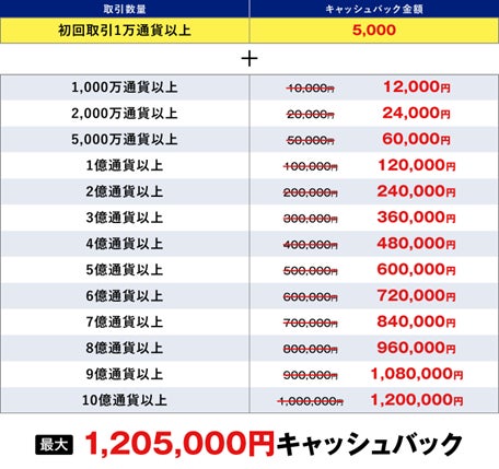 田﨑さくらさんが当社新イメージキャラクターに就任したことを記念いたしまして、8月に新しく口座開設いただいたお客さまを対象に、初回お取引1万通貨以上でもれなく5,000円、さらにお取引額に応じたキャッシュバック金額を20%増額し、最大1,205,000円をキャッシュバックいたします。