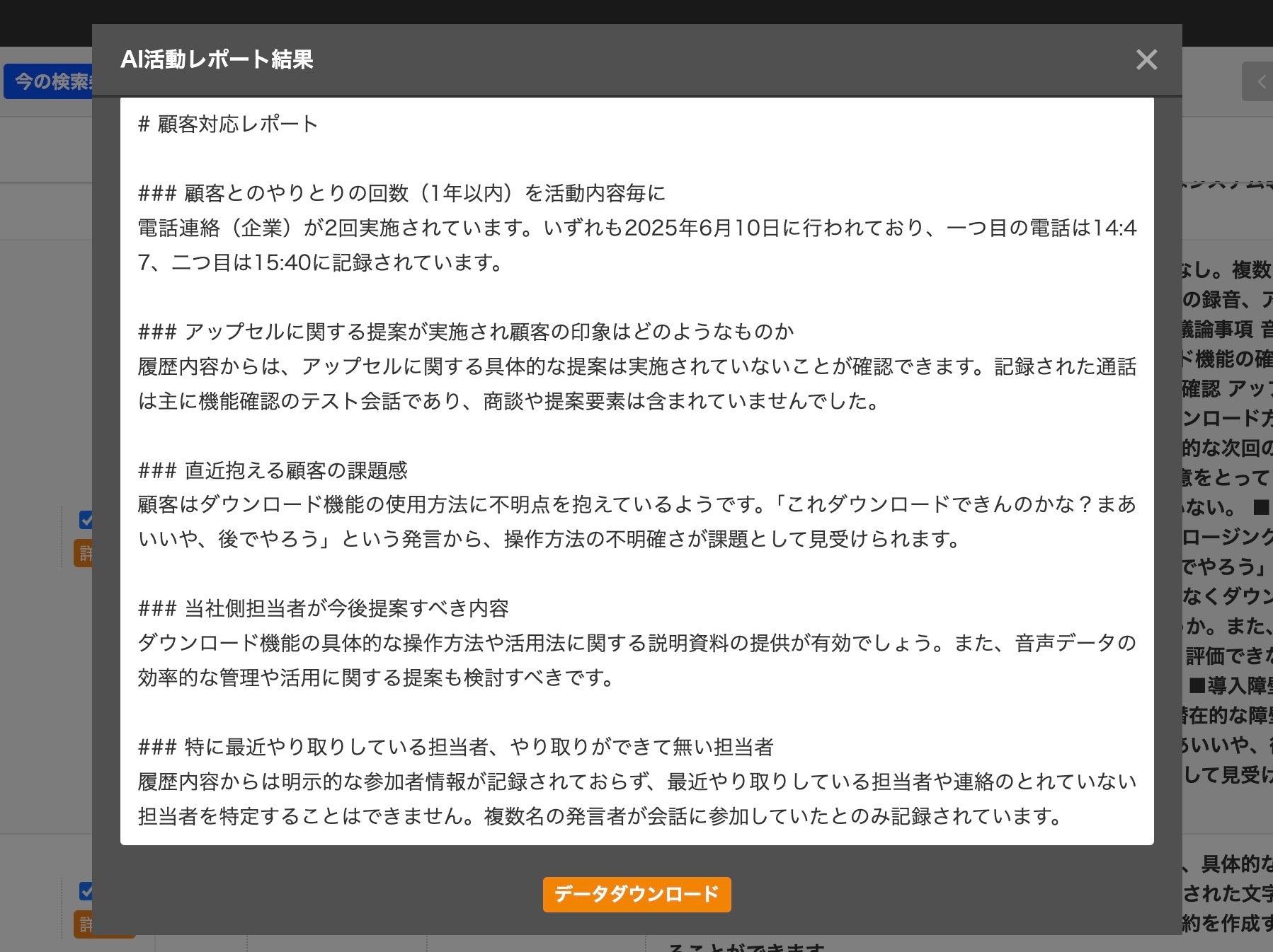 受注・失注に至った具体的な要因をAIが多角的に分析。成功の鍵や、改善すべき課題を明確にし、次なる商談戦略に活かすことが可能です。 |