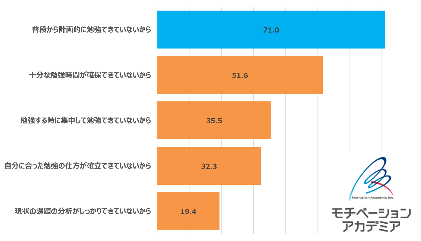 またその一方で、お子様の現在の学校内での成績が「下位」と答えた親御さんに対して、お子様の成績が下位に位置している理由を調査したところ、最も多かった回答が「普段から計画的に勉強できていないから」でした。