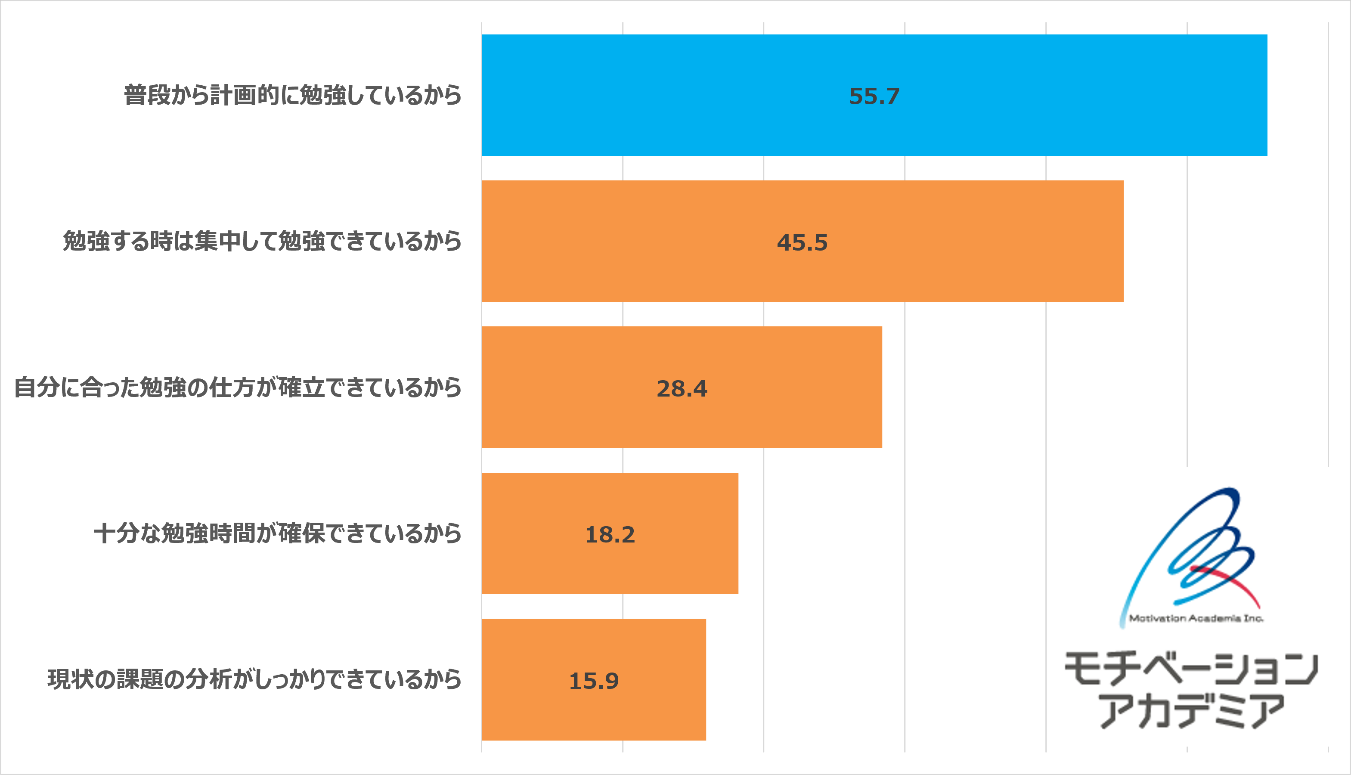 お子様の現在の学校内での成績が「上位」と答えた親御さんに対して、お子様の成績が上位に位置している理由を調査したところ、最も多かった回答が「普段から計画的に勉強しているから」でした。
