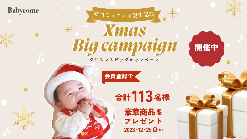 ベビカムのリニューアルと、新コミュニティ「ベビカムひろば(https://www.babycome.ne.jp/ja/hiroba-top/)」のオープンを記念して、ベビカムでは「クリスマスBIGキャンペーン」を開催中です。