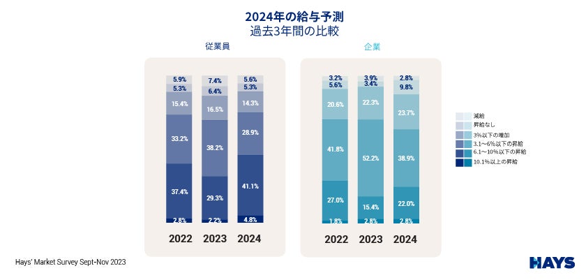 昨年と比較して大きく変化したのは、従業員が2024年の昇給はないと答えた割合で、29.3%から41.1%に上昇しました。また、減給と答えた割合も2.2%から4.8%に上昇。一方、昇給への期待は軒並み低下し、最も大きく落ち込んだのは3%以下の昇給でした(38.2%から28.9%)。