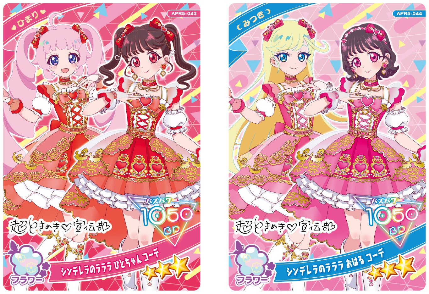 「リング5だん」で登場する「超ときめき♡宣伝部」コラボアイプリカードには、テレビアニメ新エンディング主題歌「シンデレラのラララ♡」のコーデを着た「坂井仁香」「小泉遥香」のコラボアイプリカードが登場します。カードは「ひまり(シンデレラのラララ ひとちゃん コーデ)」、「みつき(シンデレラのラララ おはる コーデ)」 、「アイリ(シンデレラのラララ おはる コーデ)」 、「リンリン(シンデレラのラララ ひとちゃん コーデ)」の4種類となっています。