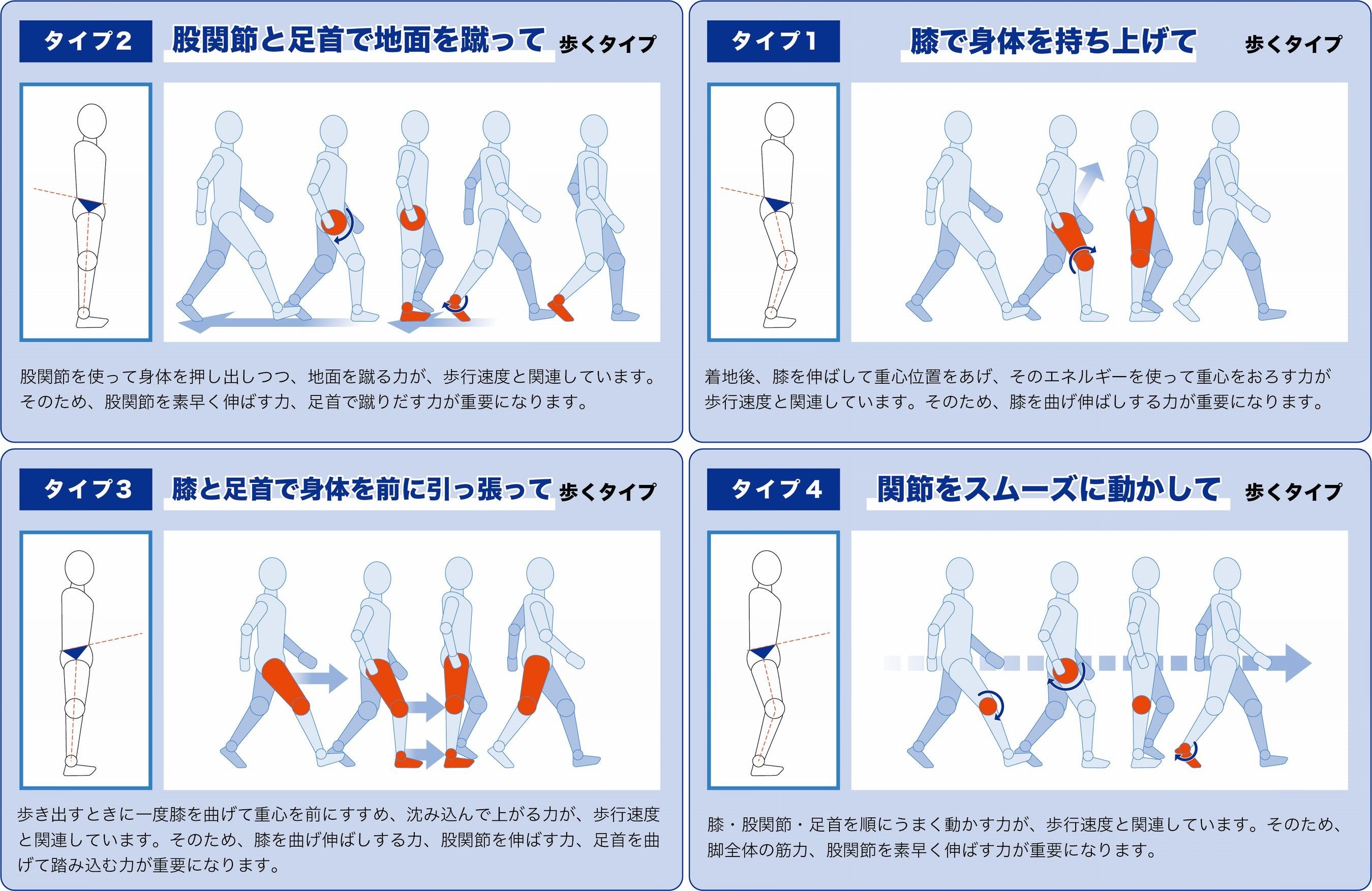 ミズノと大阪府立大学 地域保健学域 岩田晃教授との共同研究により、骨盤の傾斜角度と膝の角度という2つの視点から、立位姿勢が4つに分類できること、それぞれの姿勢で歩き方や歩行に必要な機能・部位が異なることが明らかになりました。歩行タイプ分析をおこなうことで、健康寿命と関係のある歩行機能を維持・向上させるために必要な身体機能が明らかになり、個人個人に合った歩行に必要な商品やトレーニングメニューを提案することができます。