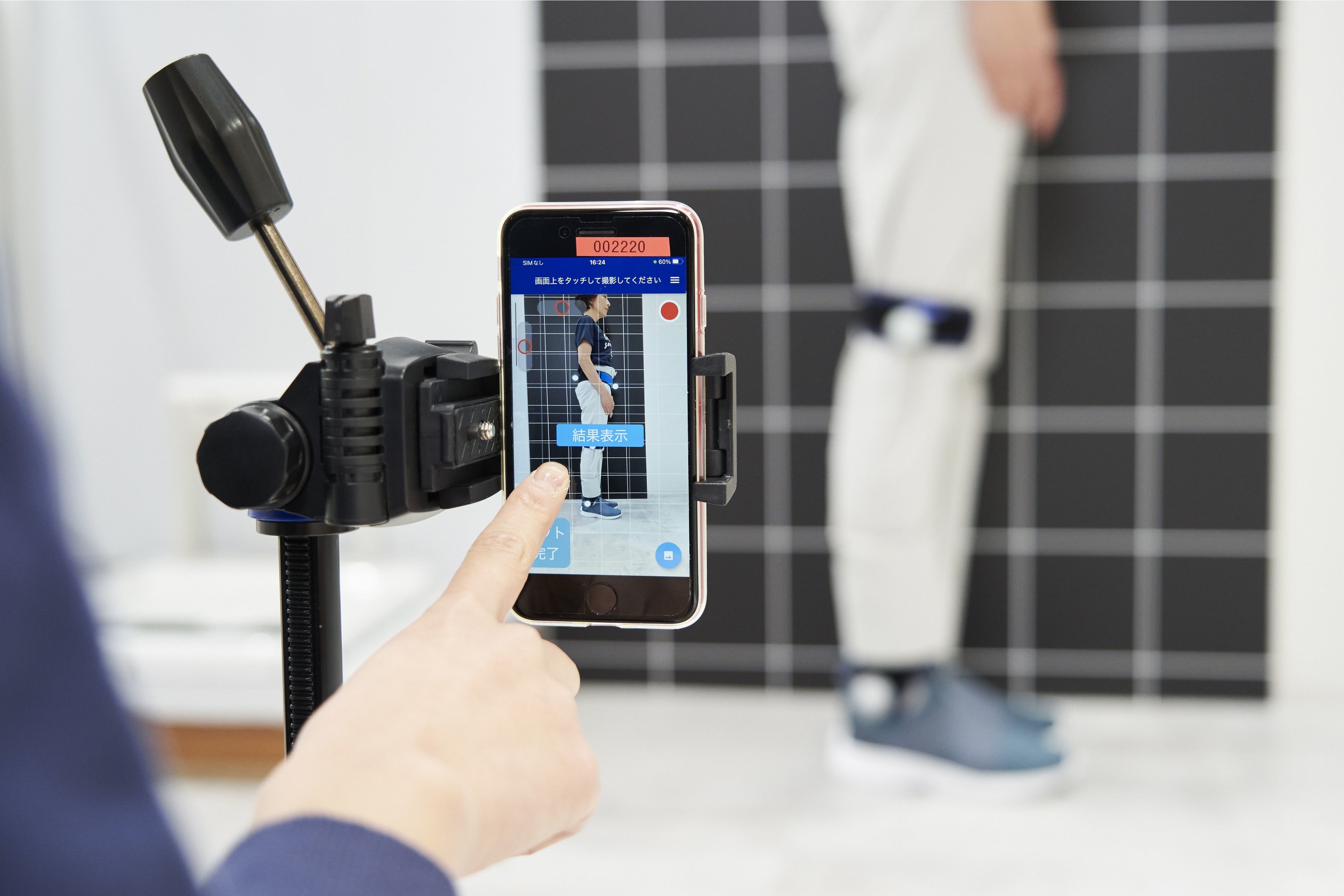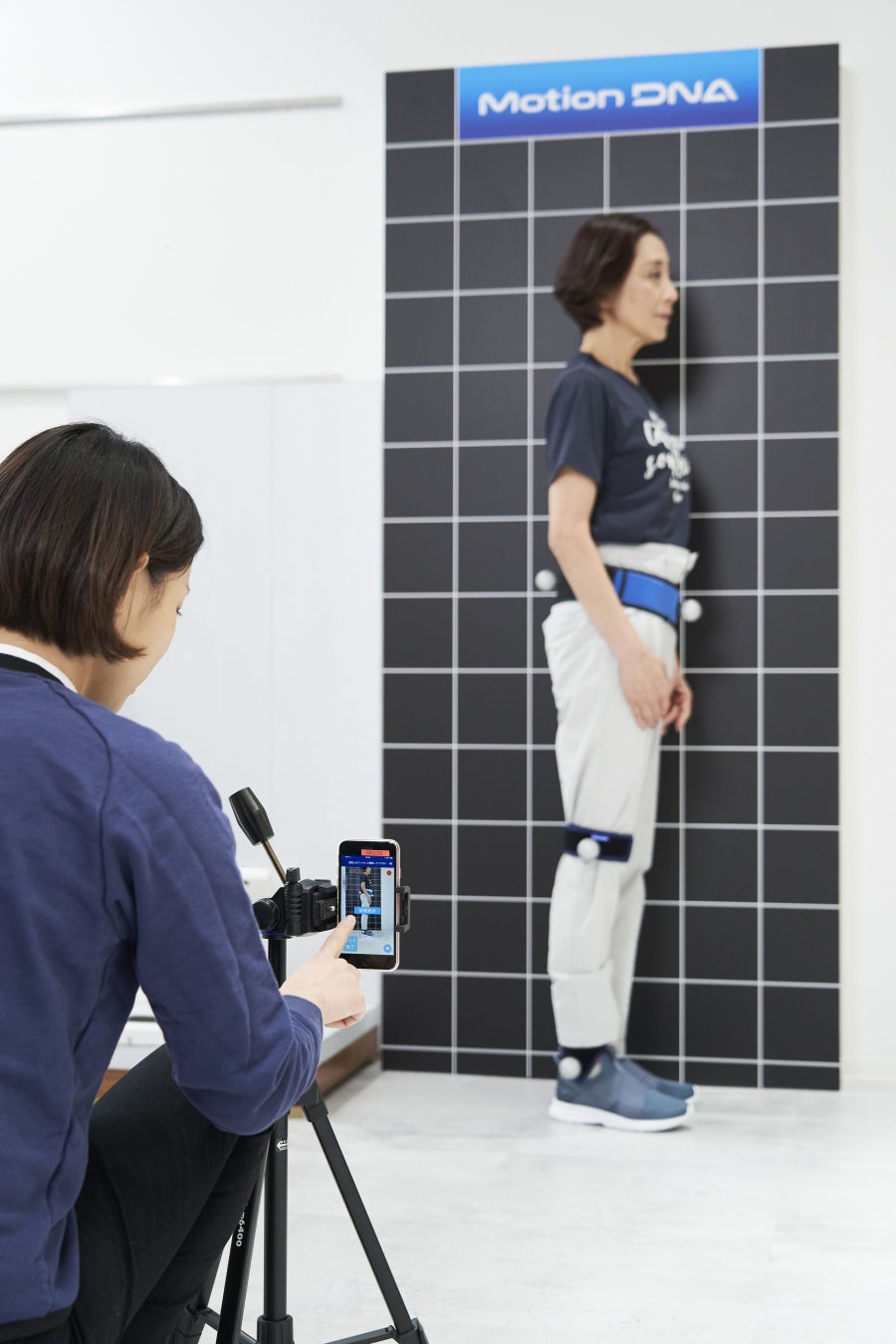ミズノと大阪府立大学が独自開発した立位姿勢測定システムとアプリケーションにより、専門的な機器や技術を使用せずに骨盤の傾きと膝の角度を高精度・短時間で測定することが可能になりました。測定用ベルトとマーカーを各部位に装着した状態で身体の側面から撮影をおこない、アプリケーションに取り込み歩行タイプを推定します。