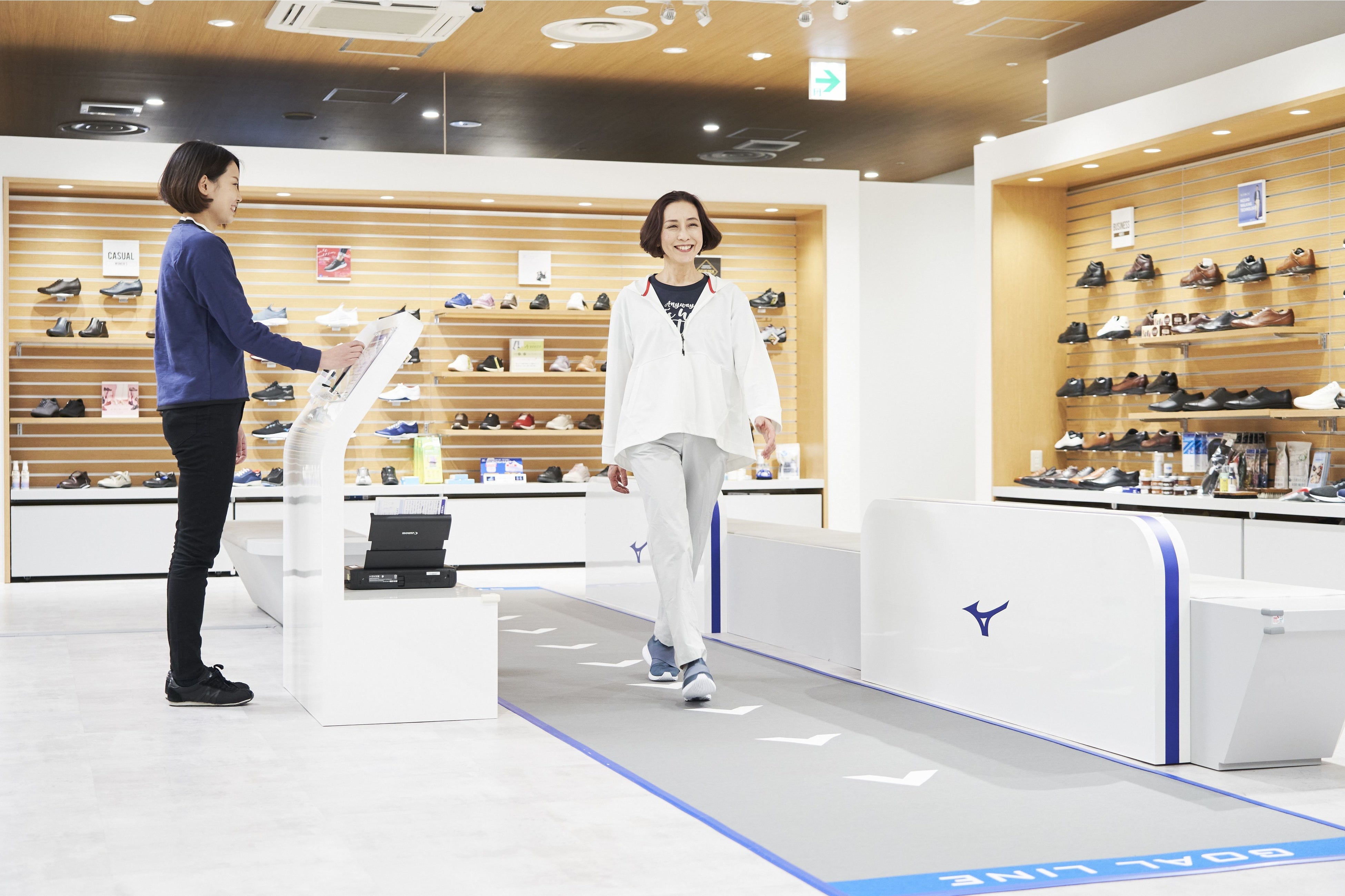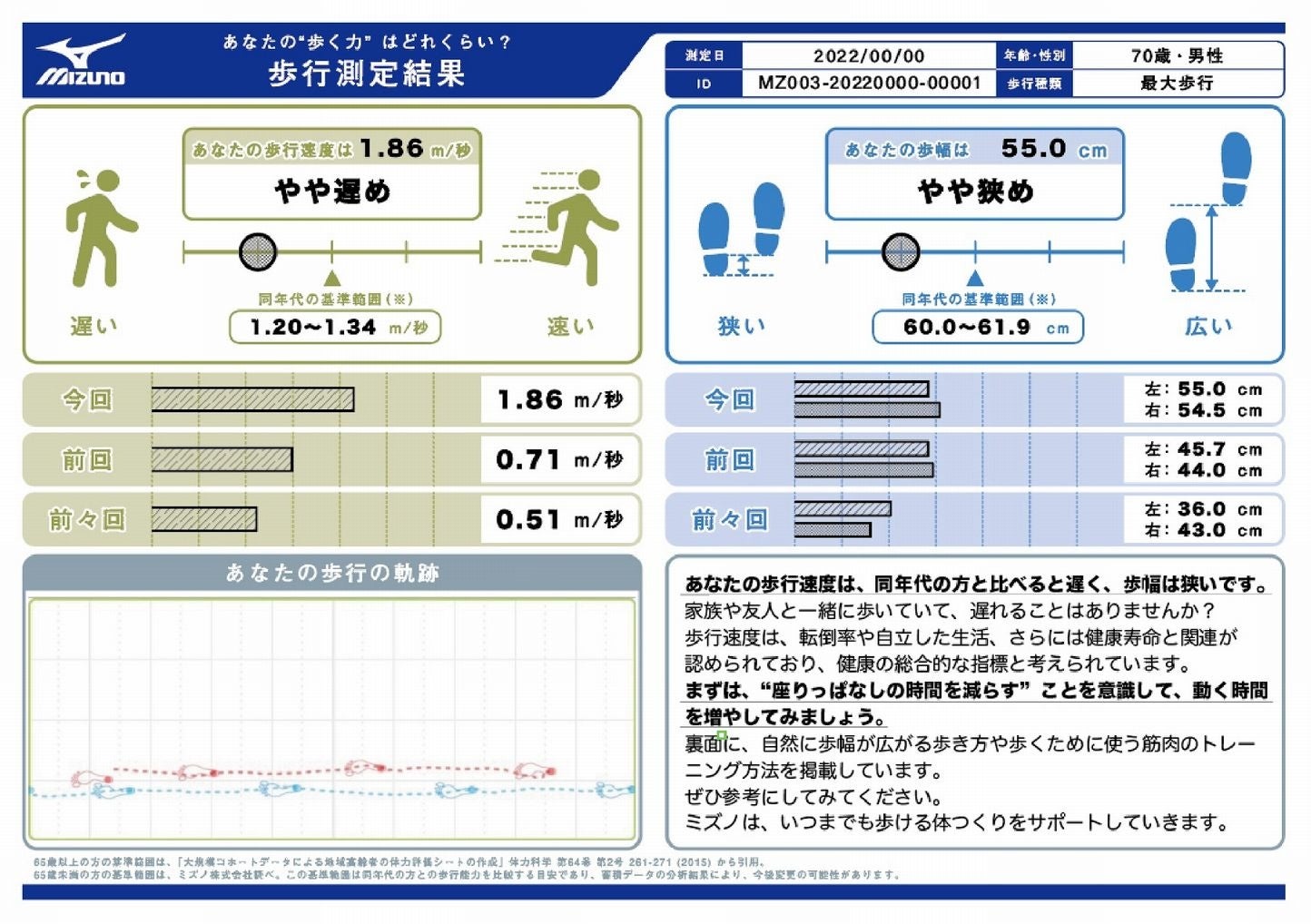 歩行能力は、ミズノ独自の設置型測定器を活用し8m歩行することで、歩行能力を構成する歩行速度・歩幅・歩行の軌跡を簡単に測定することができます。各要素の測定データは、性別や年齢ごとの基準範囲※3と比較することが可能です。ミズノは、2023年までに10万人に歩行能力測定機会の提供を目指します。