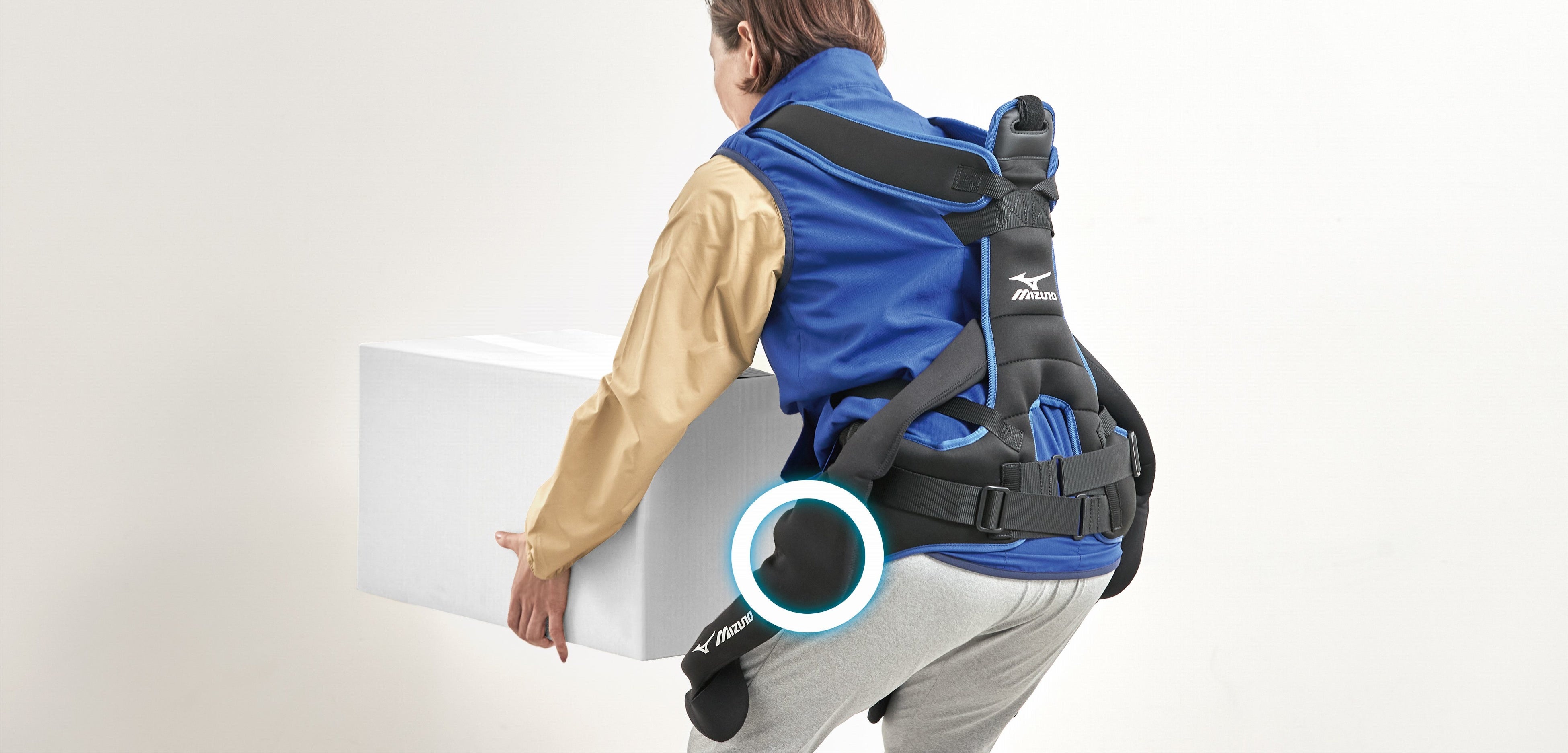 荷物の持ち上げ動作や作業時の前傾姿勢維持等の腰部補助を目的とした『ミズノパワーアシストスーツ』を、4月末から発売します。この『ミズノパワーアシストスーツ』は、ウエアと一体型になっているため、体にフィットさせて着用することが可能で着脱も簡単です。非電動式のため約3.2kgと軽量であることも特長です。『ミズノパワーアシストスーツ』を着用して荷物を持ち上げる動作をした場合、腰の筋(脊柱起立筋)の負担を約15%軽減する効果が期待できます。