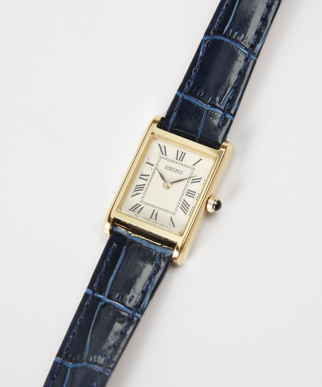 アイボリーのダイヤルにネイビーのレザーベルトがエレガントなスクエア型ウォッチ。クラシカルなローマ数字を採用し、気品を放つエレガントなルックスに仕上げました。アクセサリー感覚で身につけられるコンパクトなデザインが、日常に寄り添い、手元に女性らしさを放ちます。