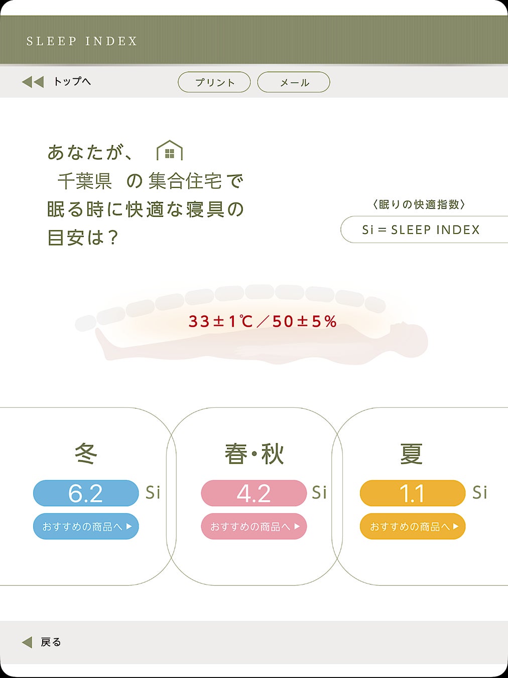 住環境の異なるメンバー10名が約1年間にわたって寝室の温度・湿度を測定した実証データと、日本睡眠科学研究所がこれまで培った理想的な寝床内環境(ふとんと体の間にできる空間の温度・湿度)の知見、そして睡眠科学の最先端技術を駆使し、「掛けふとん」選びの新たな独自理論を構築。性別・年齢・身長・体重による基礎代謝量、地域、季節別の寝室の温度、居住タイプから眠りの快適指数「Si」(保温の目安)を算出し、その指数を基に一人ひとりの睡眠に合った季節ごとの理想的な「掛けふとん」を導き出します。