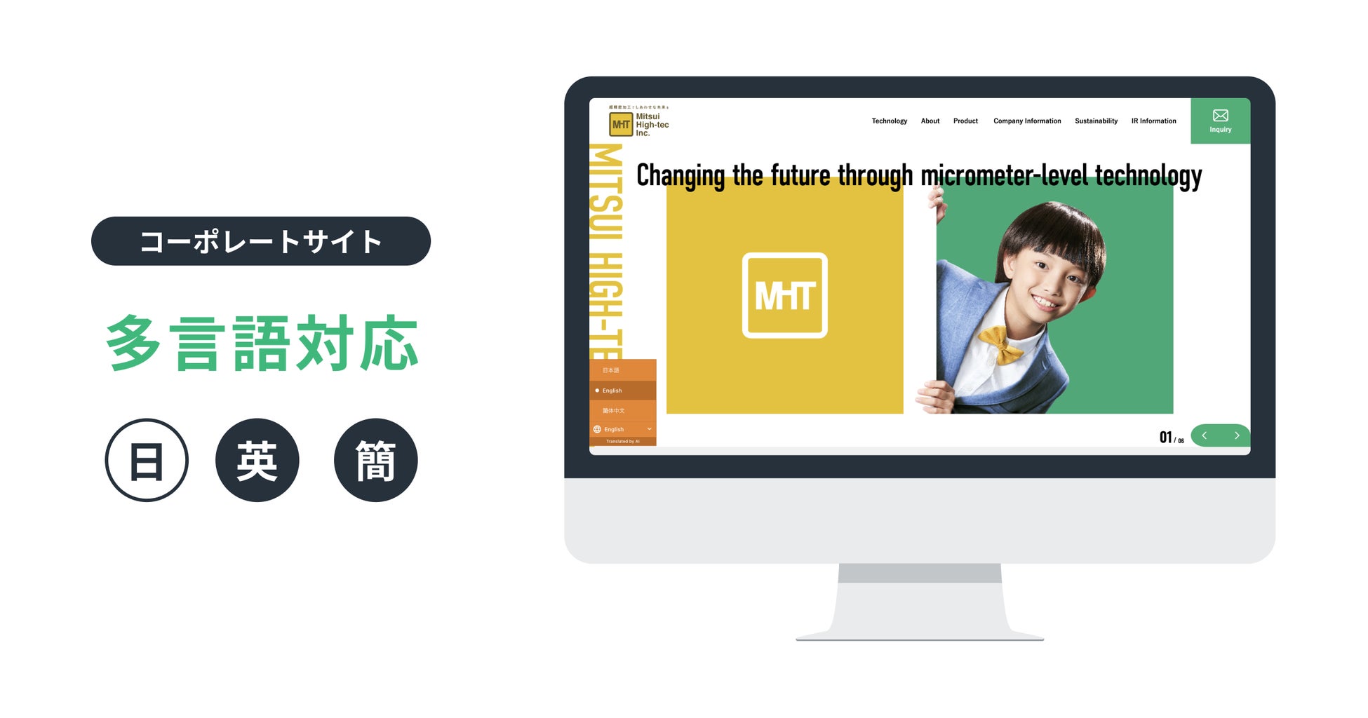 三井ハイテックのコーポレートサイトを、日本語を元言語に WOVN.io で英語と簡体字へ対応しています。多言語での情報発信量が増加したことで、サイト経由での問い合わせが増加傾向にあります。