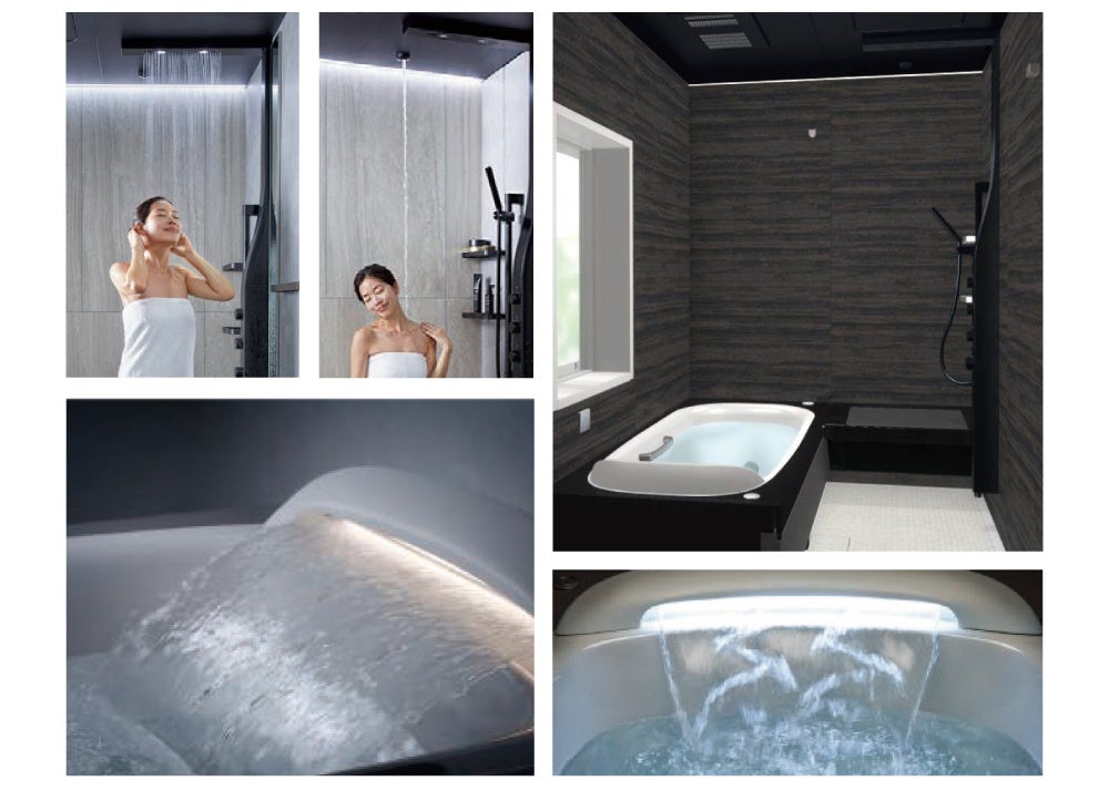 肩や首にお湯を流して温める肩湯機能やスパのようなオーバーヘッドシャワーを備えた、上質なくつろぎを演出するホテルライクなバスルームです。