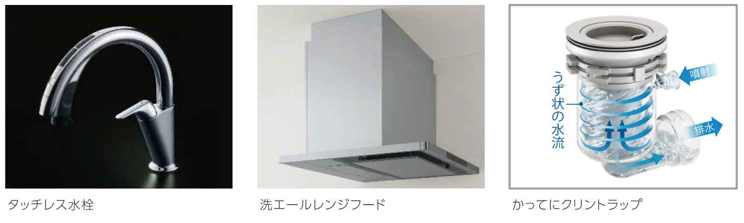 ファンフィルター自動洗浄機能付きレンジフード、タッチレス水栓、洗剤自動投入機能付き深型食器洗い乾燥機を採用。調理から後片付けまでの家事負担を軽減する機能が充実。