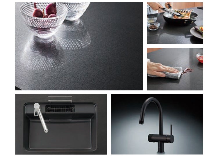 焼き物ならではの趣のある表情と熱やキズ、汚れに、優れた耐久性を発揮するセラミックトップ。美しさと使いやすさを兼ね備えた、上質な佇まいと品格のあるキッチン。