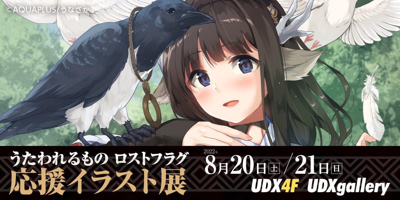 2021年に配信2周年を記念して実施した「うたわれるもの ロストフラグ」応援イラストリレーにて、総勢32名の人気クリエイターの方々に描いていただいた美麗イラストを、A3サイズの高精彩出力で展示します。
