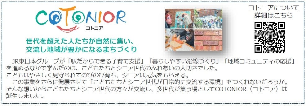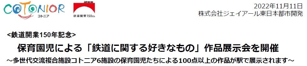 今回鉄道開業150年を記念して、コトニア6施設の保育園児たちが「鉄道に関する好きなもの」を描いてくれました。園児たちの鉄道推しの気持ちが伝わる作品をぜひご覧ください。2022年11月11日(金)~12月15日(木)鉄道開業150周年を記念して、コトニア吉祥寺、赤羽、西船橋、越谷レイクタウン、武蔵浦和、コトニアガーデン新川崎の保育園児が作成した「鉄道に関する好きなもの」をテーマとした作品展示会を開催いたします。「COTONIOR(コトニア)」は「子ども(codomo)」+と(to)+シニア(senior)」から生まれた造語で、JR東日本グループが推進する子育て支援と高齢者福祉の複合施設です。
