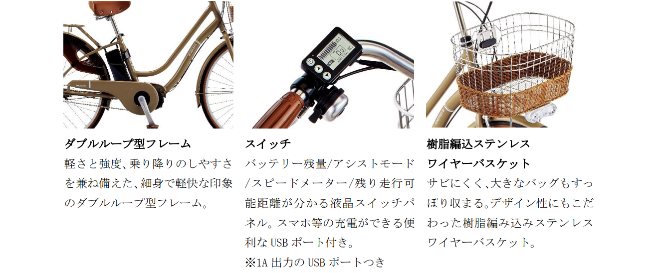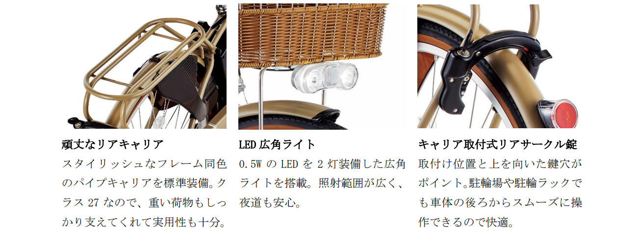 フレームは軽快で乗り降りしやすいダブルループ型を採用。学生に人気のスリムなデザインで、スタイリッシュかつ耐久性にも優れています。前かごにはデザインに調和した大容量の籐風バスケットを採用し、見た目も美しく機能性も抜群です。カゴ下に配置された前照灯には0.5W×2灯のLED広角ライトを使用し、夜間の視認性と安全性を高めています。また、5mm厚の耐パンクベルトを採用したパンクに強いタイヤを装備し、通学途中のトラブルを低減するほか、ハンドル、ステム、シートポストには錆に強いステンレス素材を使用しており、雨の日でも安心してご使用いただけます。