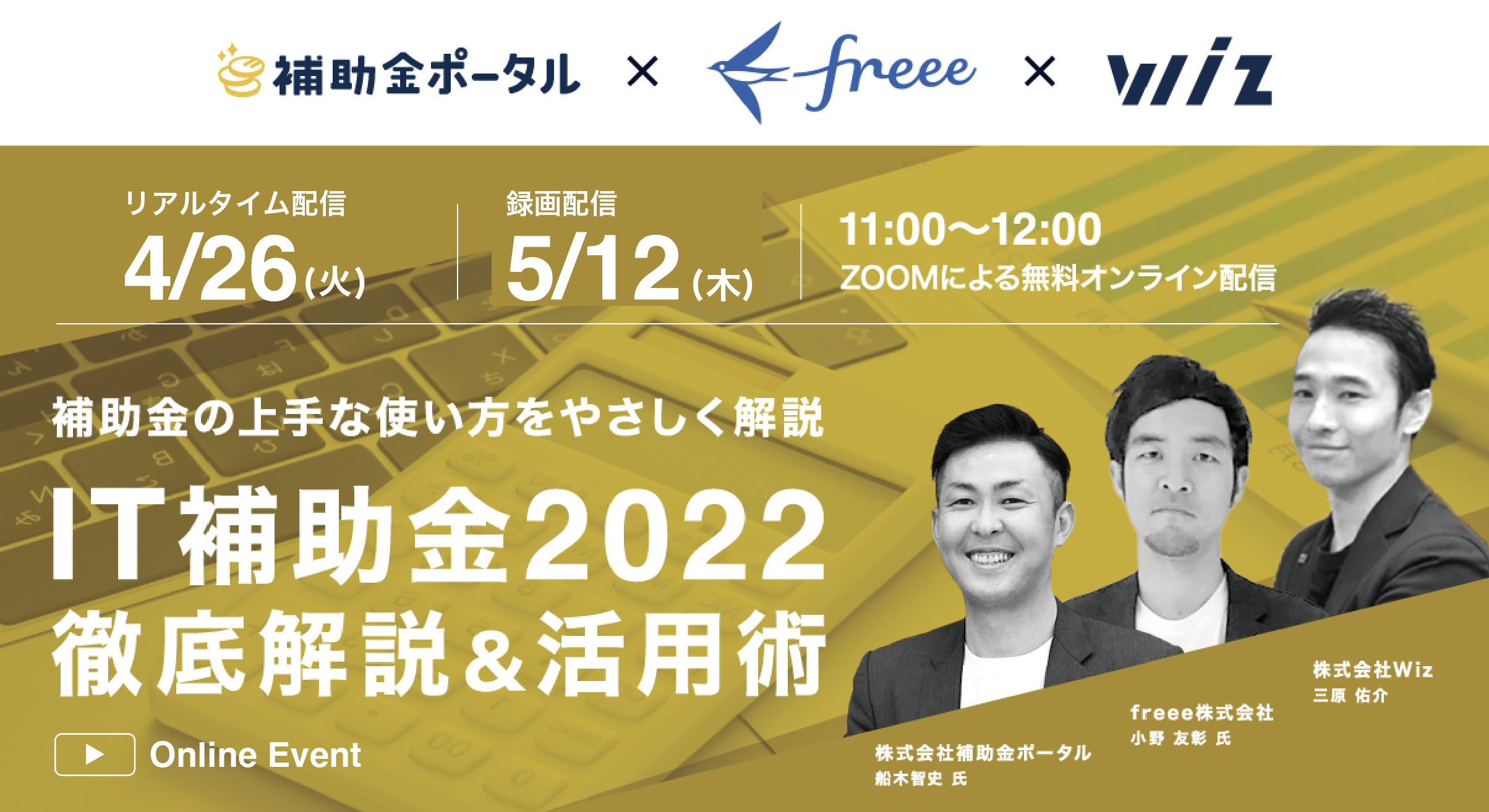 4月26日(火)、5/12(木)※、Wizは【株式会社補助金ポータル パートナーコンサルタント 船木 智史 氏】【freee株式会社 アライアンス事業部 マネージャー 小野 友彰 氏】をお迎えして、「IT導入補助金2022」徹底解説&活用術セミナーをオンラインにて無料開催します。 全国の中小企業・新設法人・実店舗を持つ企業の方々に向けて、「IT導入補助金2022」の詳しい解説や活用術をお届けします。