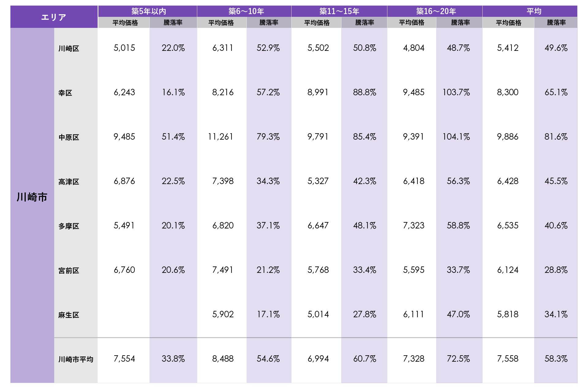 川崎市では、中原区が平均価格9,886万円で最も高く、市内で平均価格が1億円を超える区はありませんでした。平均騰落率は中原区が最も高く新築分譲時プラス81.6%でした。築年数別の平均騰落率では幸区の築16~20年が103.7%、中原区の築16~20年が104.1%で平均騰落率100%(新築時価格の約2倍)を上回りました。川崎駅、新川崎駅周辺のタワーマンションが相場をけん引しています。