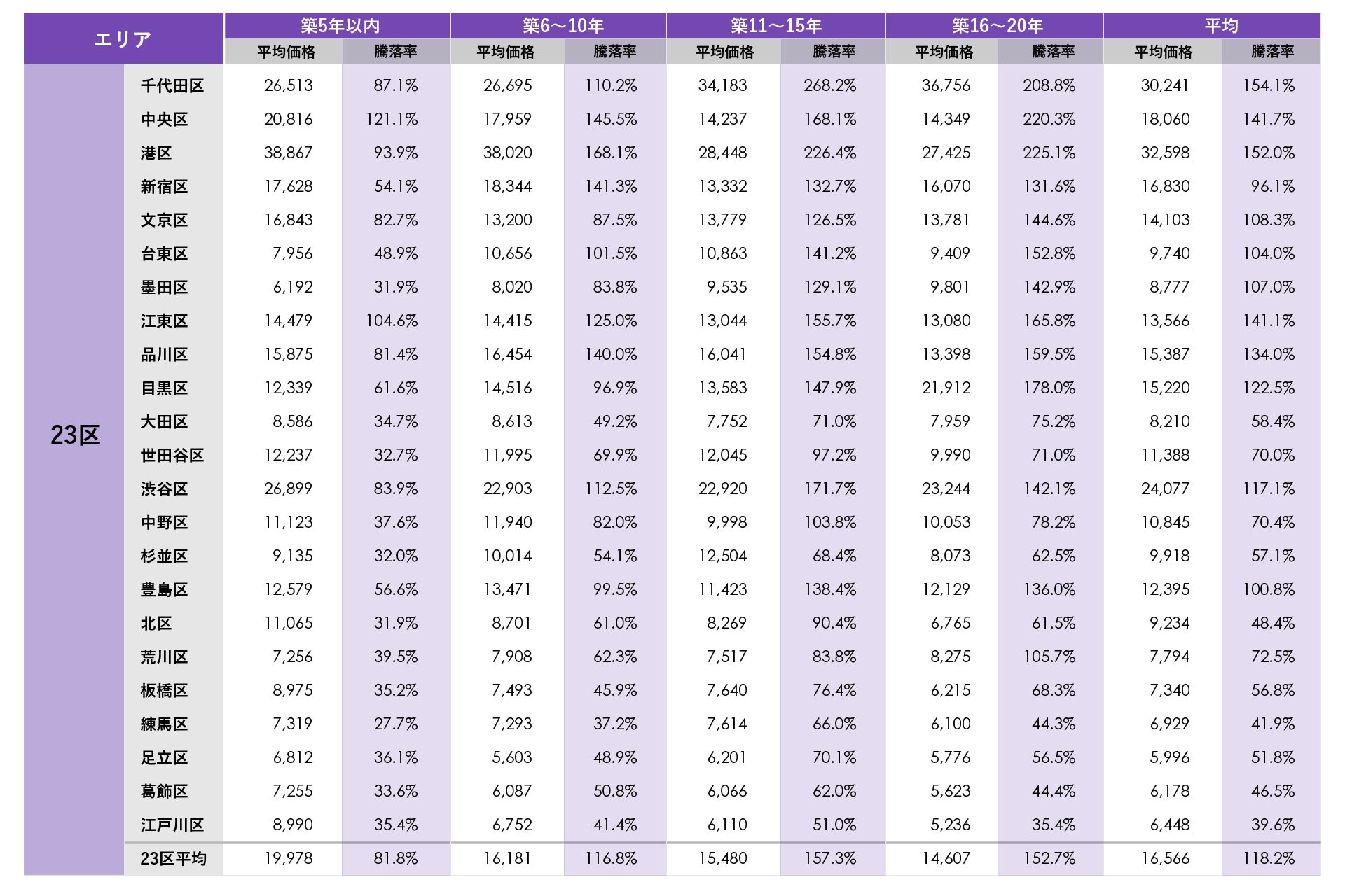 東京23区では、千代田区、中央区、港区、新宿区、文京区、江東区、品川区、目黒区、世田谷区、渋谷区、中野区、豊島区の12区で平均価格が1億円を超えました。その他台東区、杉並区、北区が9,000万円台、墨田区と大田区が8,000万円台で、高値相場を形成しています。平均騰落率が最も高かった千代田区では新築分譲時プラス154.1%(新築時価格の約2.5倍)、2番目に高かった港区でも平均騰落率がプラス152.0%(新築時価格の約2.5倍)となり、計11区が100%(新築時価格の2倍)以上の平均騰落率となりました。築年数別で特に騰落率が高いのは千代田区の築11~15年、築16~20年、中央区の築16~20年、港区の築11~15年、築16~20年で平均騰落率がプラス200%(新築時価格の3倍)を上回りました。